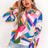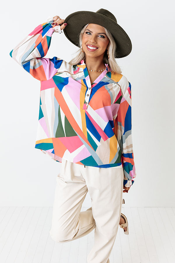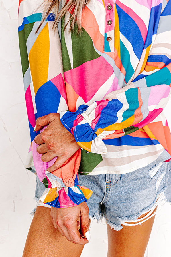 Life's a party, so dress like it in our vibrant 'Day Cafe Shift Top' featuring lightweight material patterned with a geometric pink, blue, green, yellow, and orange print, a button up bodice with a rounded neckline, long loose sleeves with elastic cuffs, and a relaxed silhouette that falls into a rounded hemline! Due to manufacturing there may be variations in color pattern, no two are alike.
