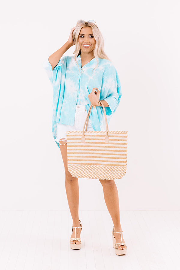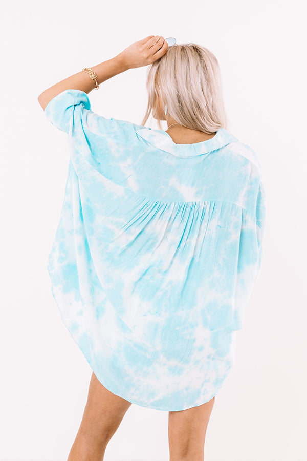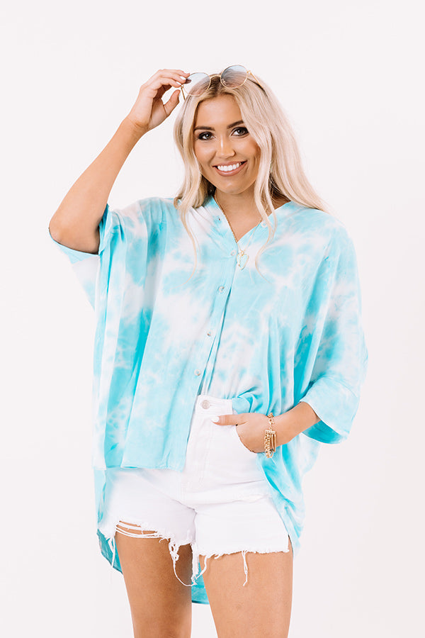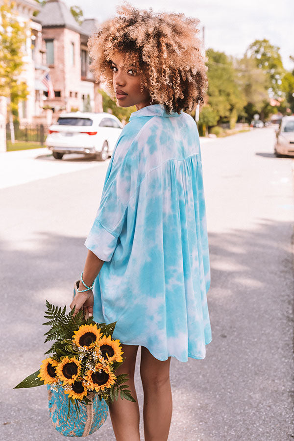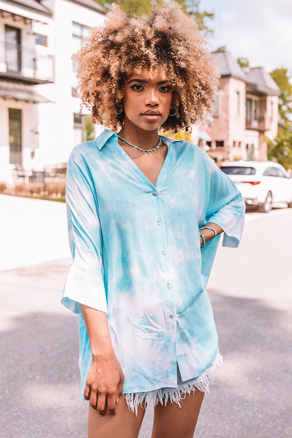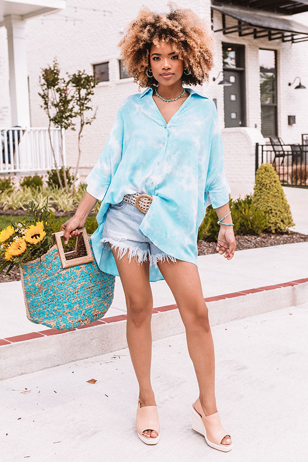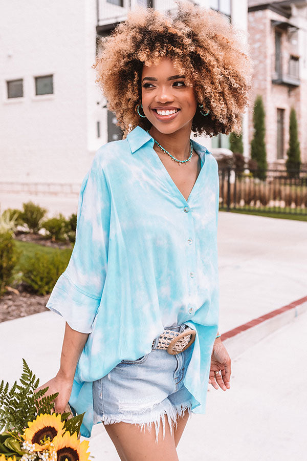 Get day date ready in this flirty and fabulous shift tunic featuring lightweight breezy material patterned with sky blue tie dye, a button down front with a collared v-cut neckline, oversized half sleeves, and an ultra relaxed silhouette that falls into a rounded high/low hemline! Measurements