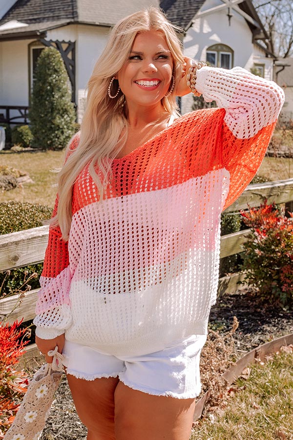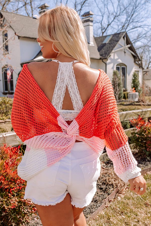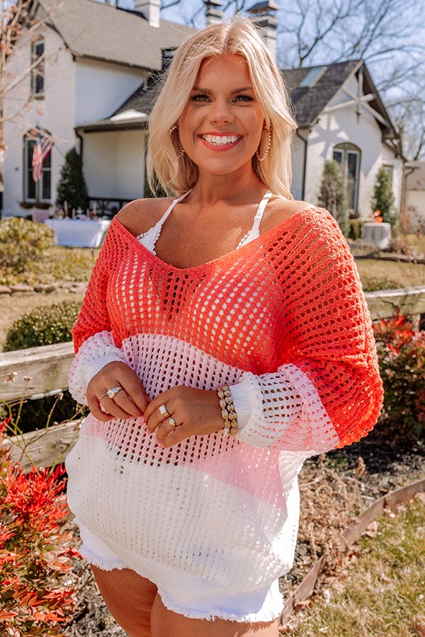 Spend you day on the beach in style with this cute plus size top featuring ultra lightweight semi-sheer lace material with coral, light pink, and cream hued color block panels, a scooped front hemline and a twisted back detail with a deep v-cut, long loose sleeves, and a slouched silhouette that falls into a straight hemline! For additional coverage, we recommend styling over your fave bralette or camisole!