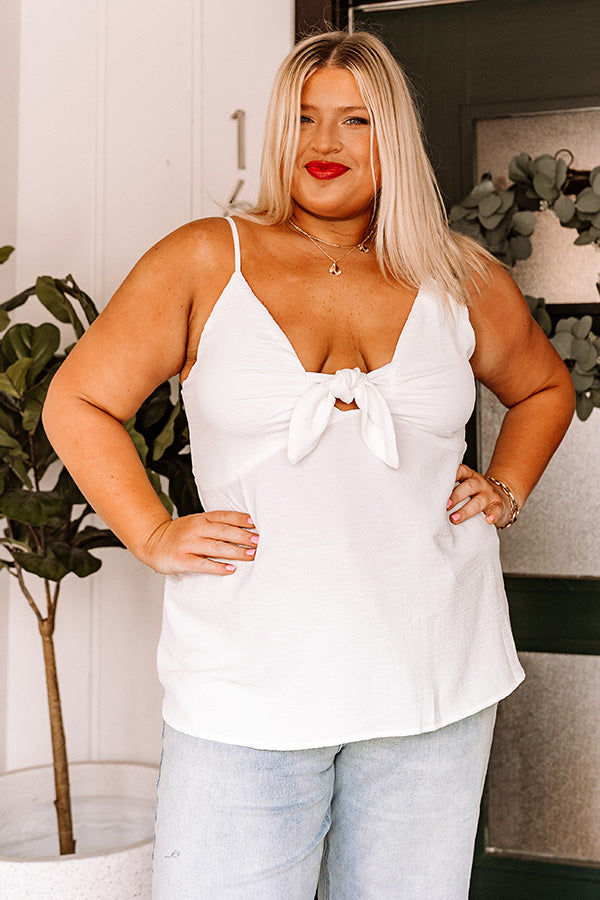 Spend your days in the sun in style with this flirty white plus size top featuring lightweight material, a v-cut neckline with a front tie accent, a flattering bodice with adjustable spaghetti straps, and a relaxed silhouette that falls into a straight hemline!