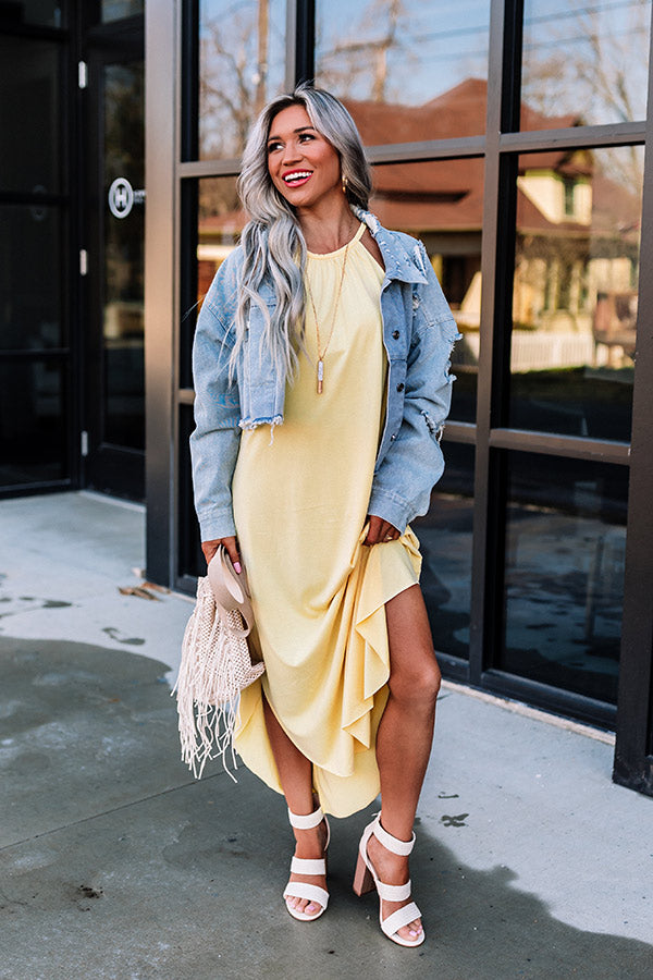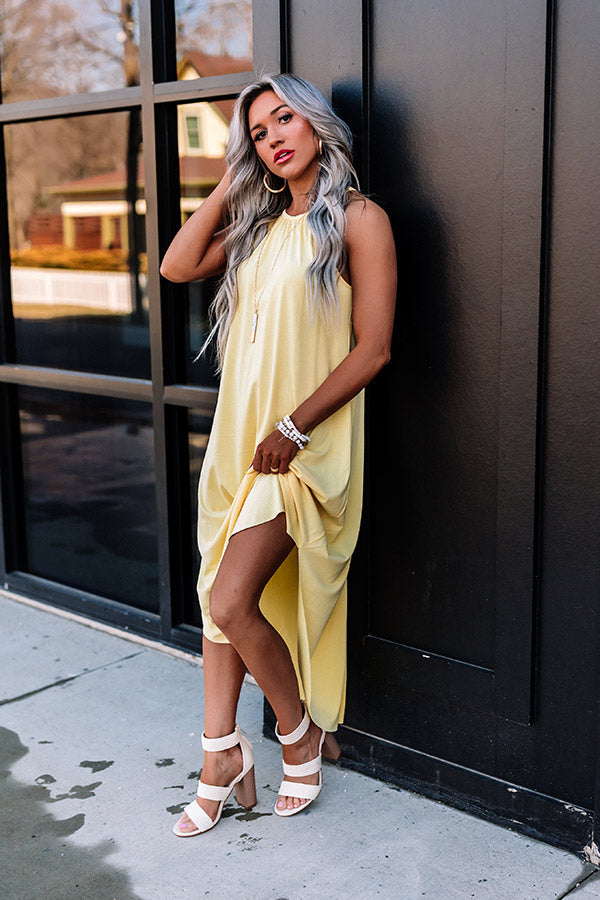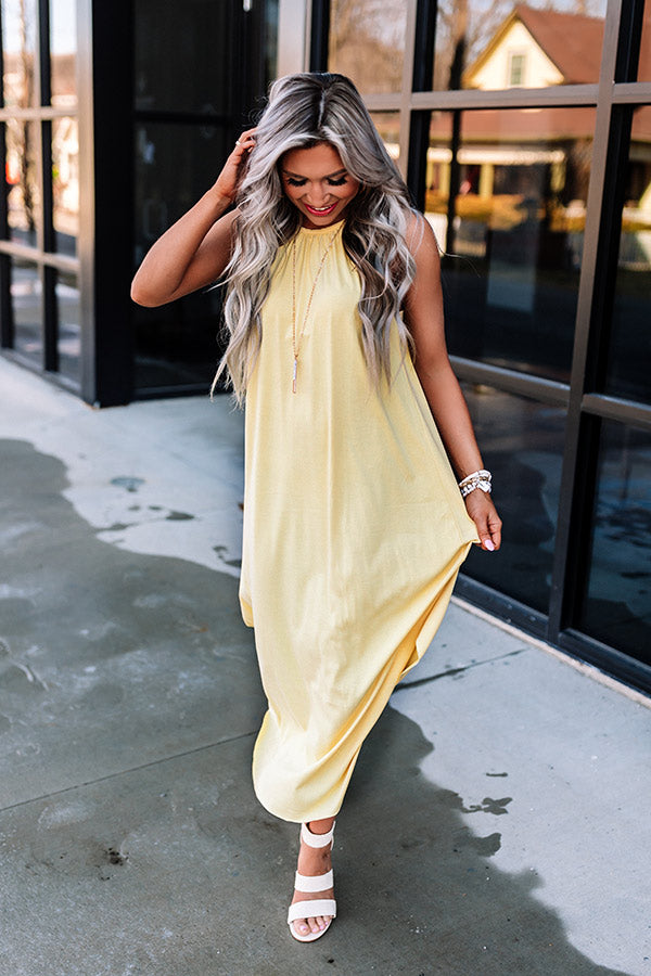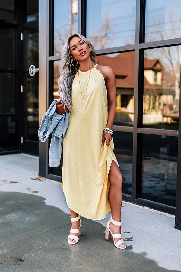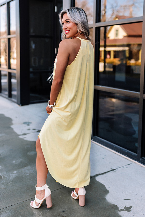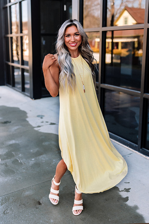 Spend your day in the sun in style with this chic yellow midi dress featuring soft lightweight material, a rounded neckline with a sleeveless silhouette, a keyhole accented upper back with a button closure, and a relaxed silhouette that falls into a rounded mid-calf length hemline!
