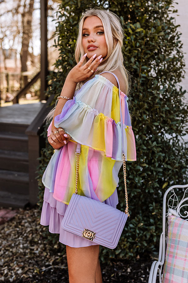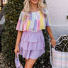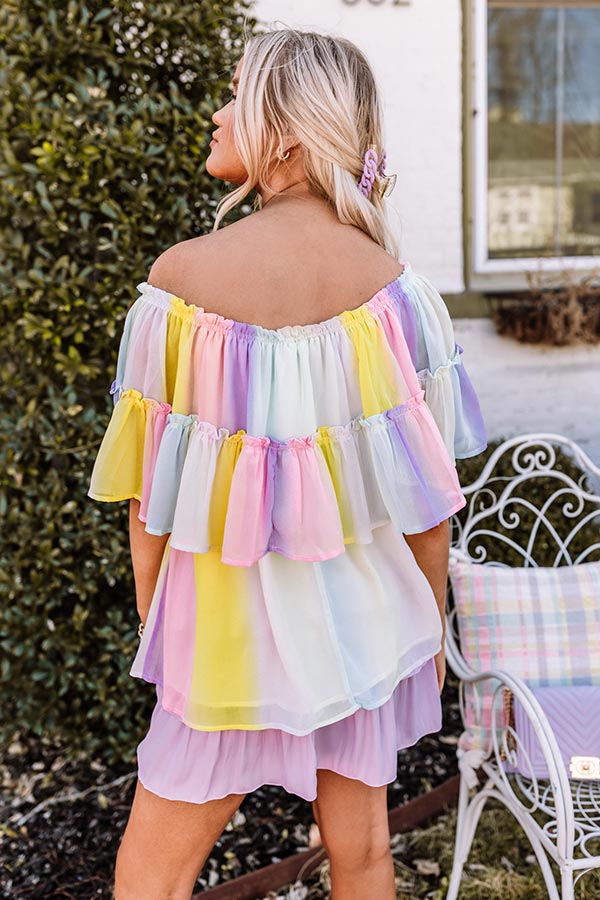 Live your life colorfully in our vibrant 'Daytona Beach Day' top featuring lightweight shift material with ruffled pastel layers, a straight elastic off-shoulder neckline with short drop sleeves, and a relaxed silhouette that falls into a straight hemline!