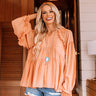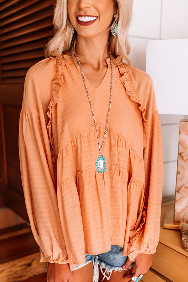 Get date night ready in this darling peach colored top featuring lightweight material, a v-cut neckline with a subtly ruffled collar, long loose sleeves with ruffles seam accents, and a relaxed tiered babydoll silhouette that falls into a straight hemline!