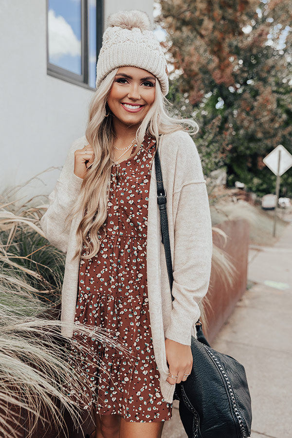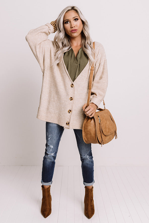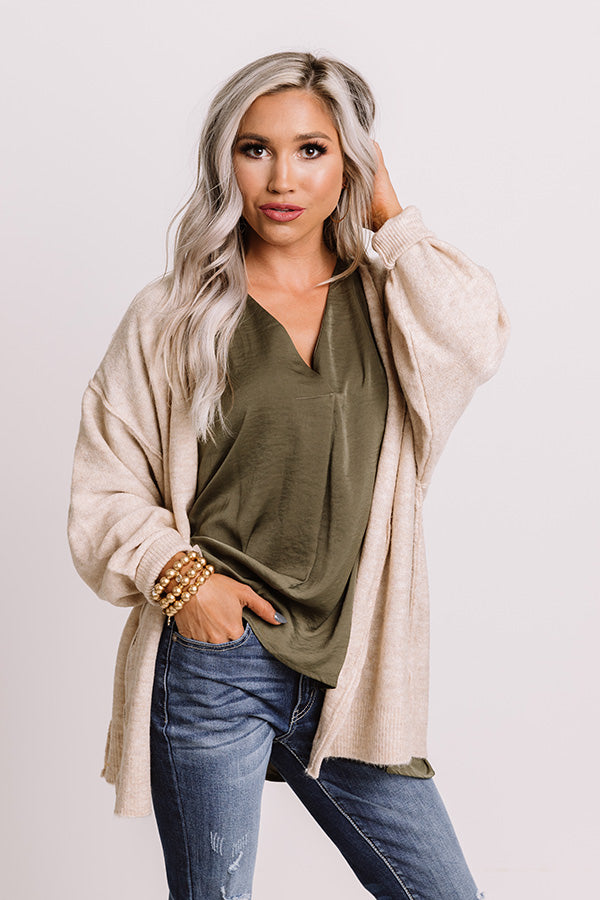 Welcome autumn in style and warmth with this adorable birch colored cardigan featuring soft lightweight tight knit material, long loose sleeves with fitted cuffs that look cute rolled, ribbed trim detailing, a low button up front with a deep v-cut neckline, and an ultra draped silhouette that falls into a straight tunic-length hemline! Measurements