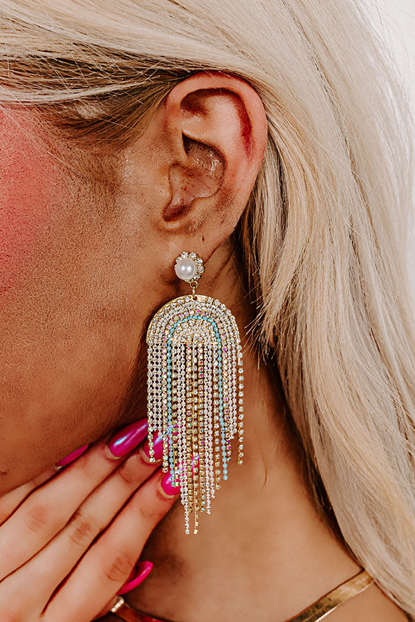 - Rhinestone framed faux pearl studs and a shimmering rhinestone fountain design with gold toned accents