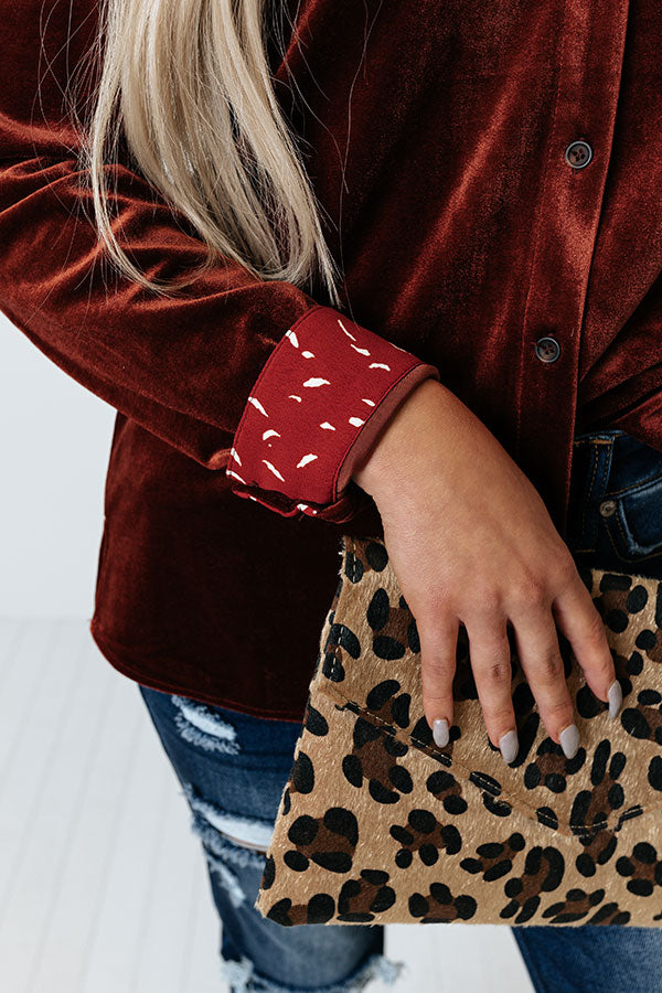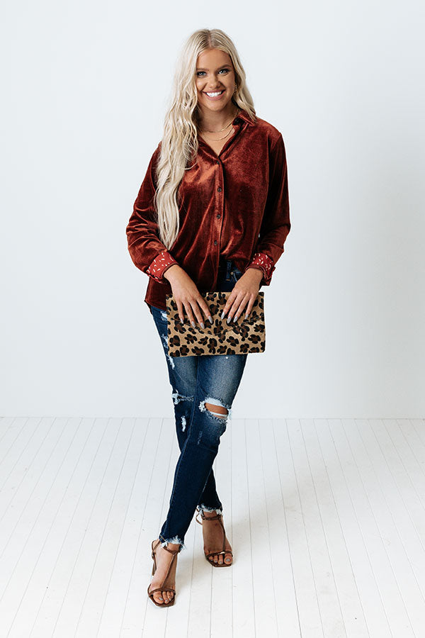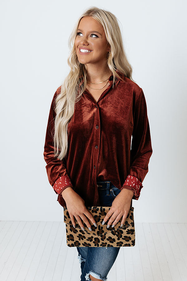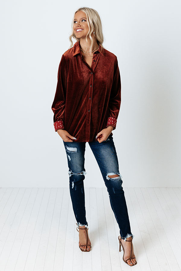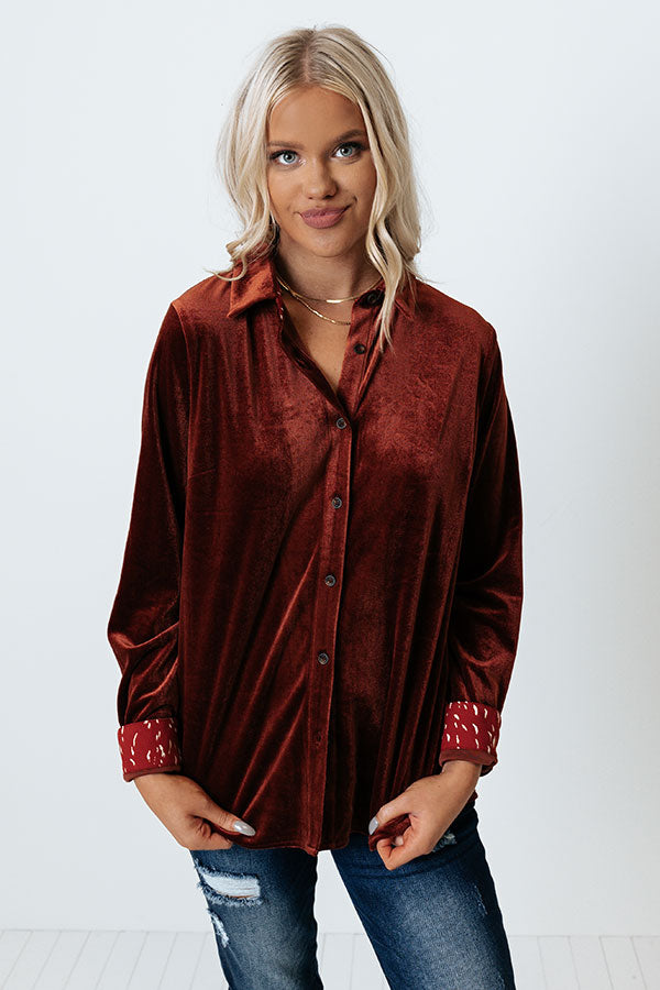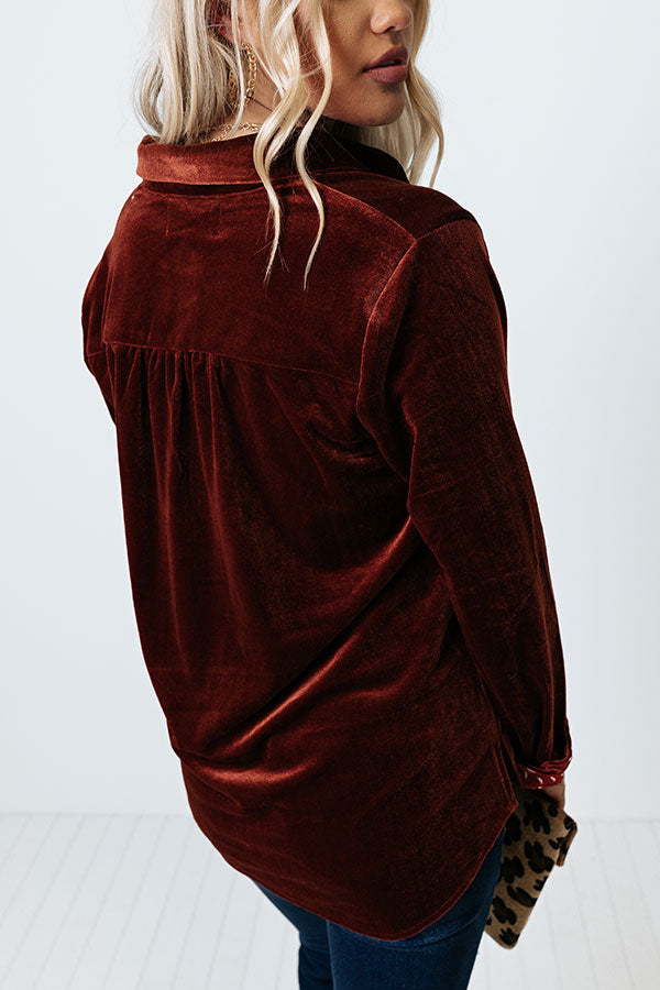 Keep it classy in our dark rust/aurora red hued 'Deep Inside My Heart' top featuring gorgeous velvet material, a button down front with a collared neckline, long loose sleeves with button closure cuffs, and a relaxed but timeless silhouette that falls into a rounded hemline!