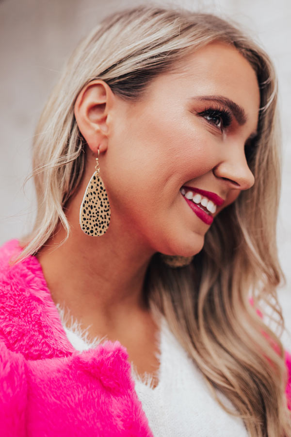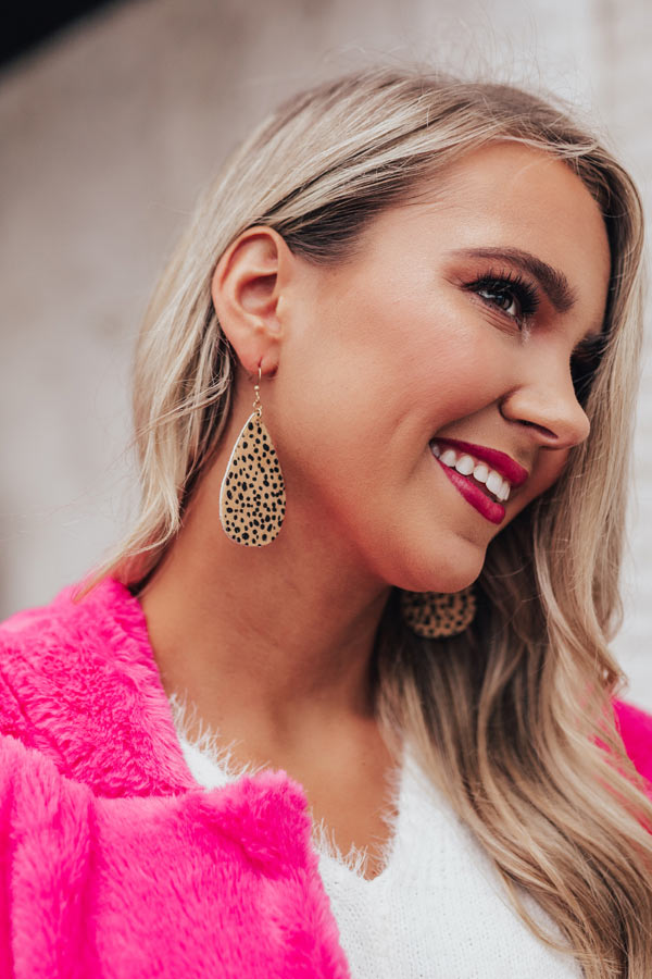 Go ahead and fulfill your "deepest desire" by buying these adorable neutral hued statement earrings featuring faux leather teardrop pendants patterned with a bold black spotted cheetah print!
