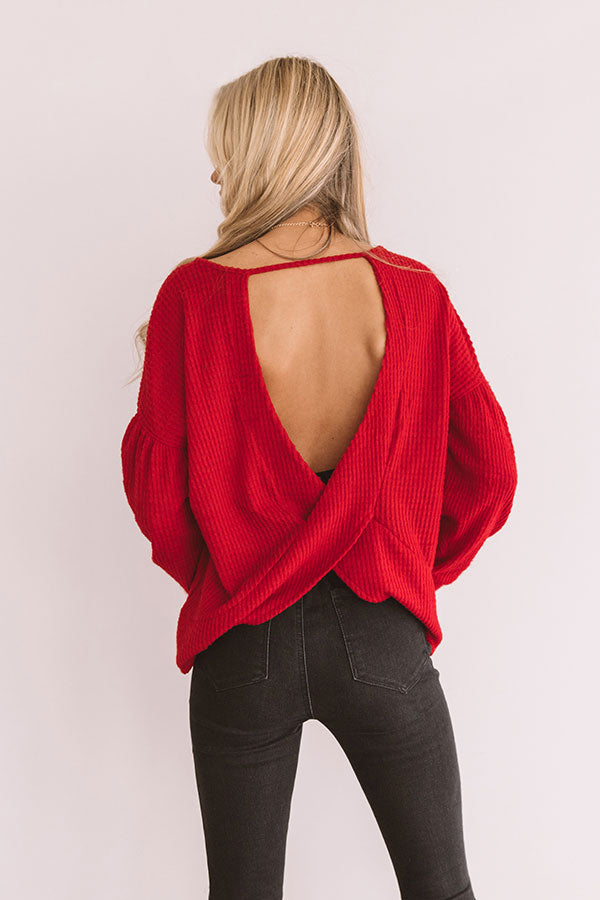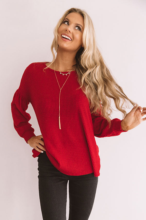 Our red "Deepest Desire" top is a year round fave with its soft lightweight material with waffle knit texturing, a high rounded neckline, long sleeves with bubble forearms and fitted cuffs, an open criss crossed back with a strap closure, and a relaxed silhouette that falls into a straight hemline! We have styled this adorable transitional piece with some distressed black flares, white booties, and a leopard crossbody, but you can also wear it with some frayed light wash ankle skinnies, "The Parker Faux Suede Lace Up Heel in Scarlet," and "The Aurora Hat in Black!" Measurements