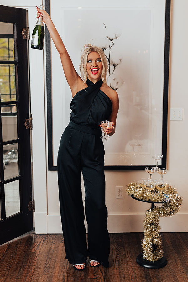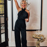 Effortlessly get ready for any holiday or new years occasion in our flattering black 'Deeply Loved' jumpsuit featuring lightweight satin material, a high neckline with a sleeveless silhouette, a cinched waistline with an open back, and a relaxed pants silhouette that falls straight into ankle-length hemlines! Measurements