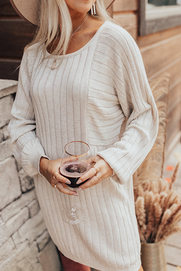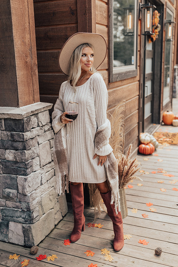 Upgrade your fall wardrobe with our darling stone colored 'Deer Valley Resort Sweater Dress' featuring soft knit material with thick ribbed texturing, a rounded neckline, long loose sleeves with fitted cuffs, and a relaxed but flattering silhouette that falls into a straight mid-thigh length hemline!