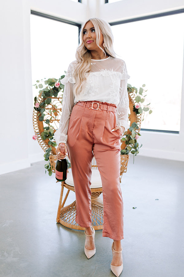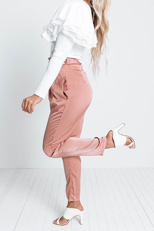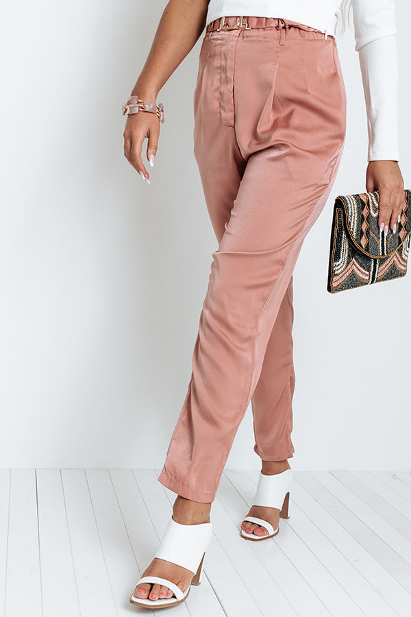 You will look like a total girl boss in our luxe blush 'Defined Bliss' pants featuring lightweight satin material, a high waistline with a matching gold buckle belt, hidden side pockets, and a relaxed but flattering sihouette that ends in ankle-length hemlines!
