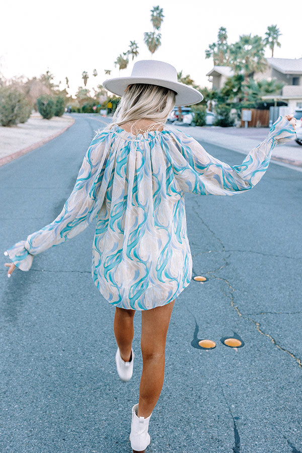 Our pretty 'Delightful Endeavor Shift Top' is sure to be a conversation starter with its lightweight material, abstract teal and natural hued pattern, v-cut neckline with a tie closure and subtle ruffle trim detailing, long loose sleeves will flared cuffs, and relaxed silhouette that falls into a rounded hemline!