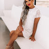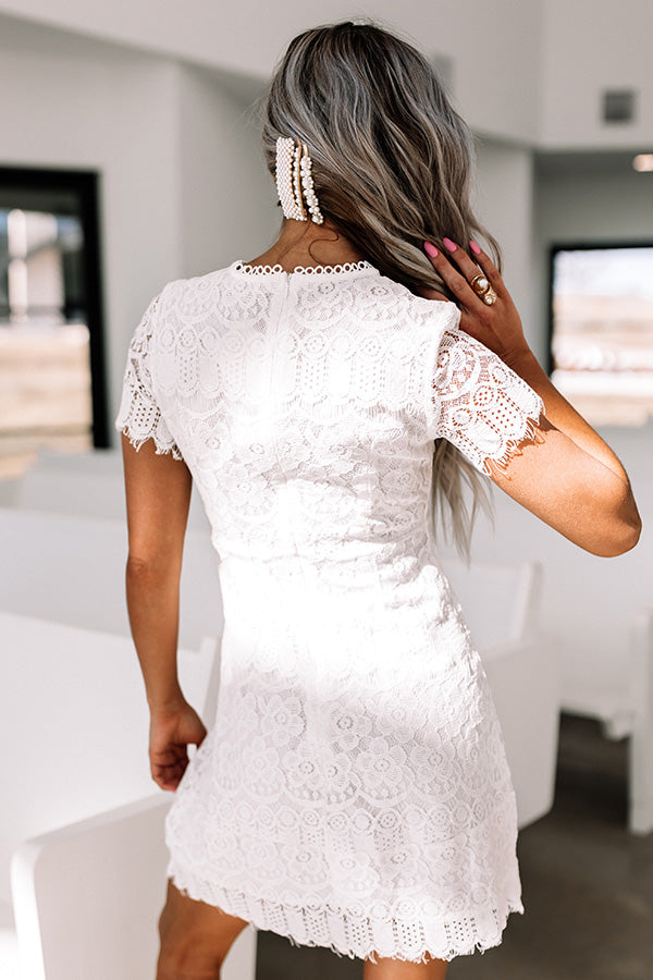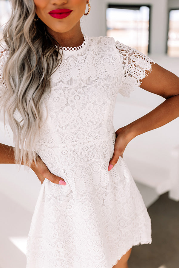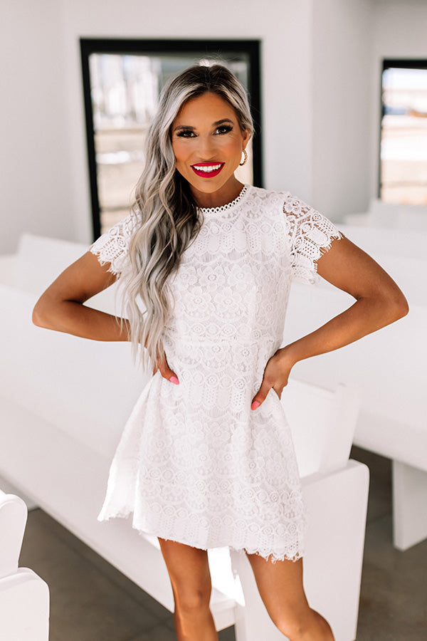 You are guaranteed to have a delightful night when you wear this pretty white dress featuring intricate lace material, a rounded neckline, short sleeves, a zip closure in the back, and a relaxed but flattering silhouette that falls into a mid-thigh length hemline! Measurements