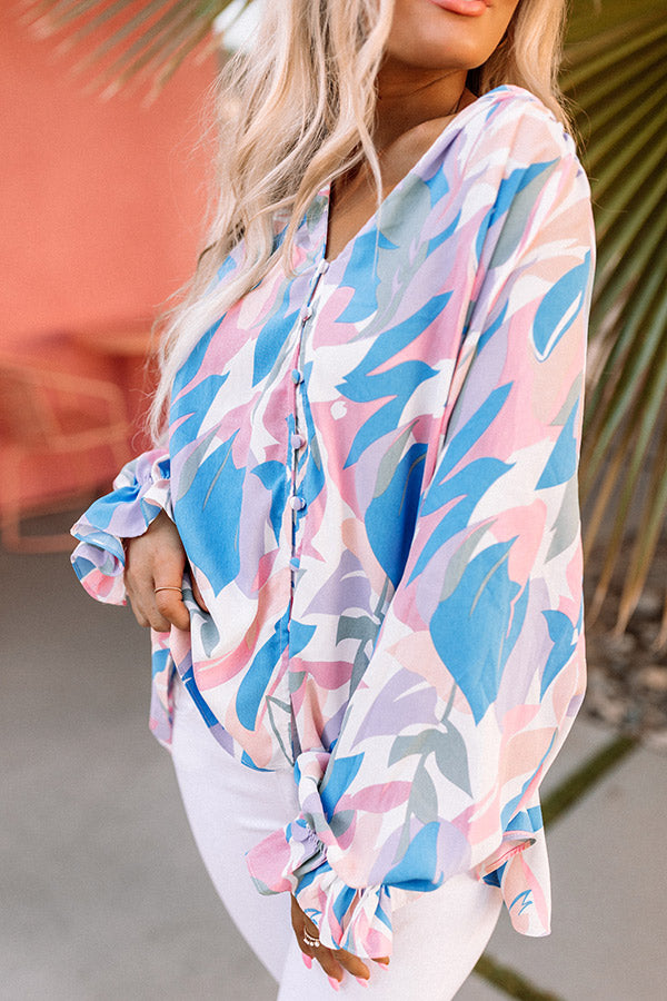 Live your life colorfully in our pretty white 'Delightful Night Shift Top' featuring lightweight material patterned with a blue, light green, peach, and pink abstract print, a button down front with a v-cut neckline, long bishop sleeves with subtly flared cuffs, and a relaxed silhouette that falls into a rounded hemline!