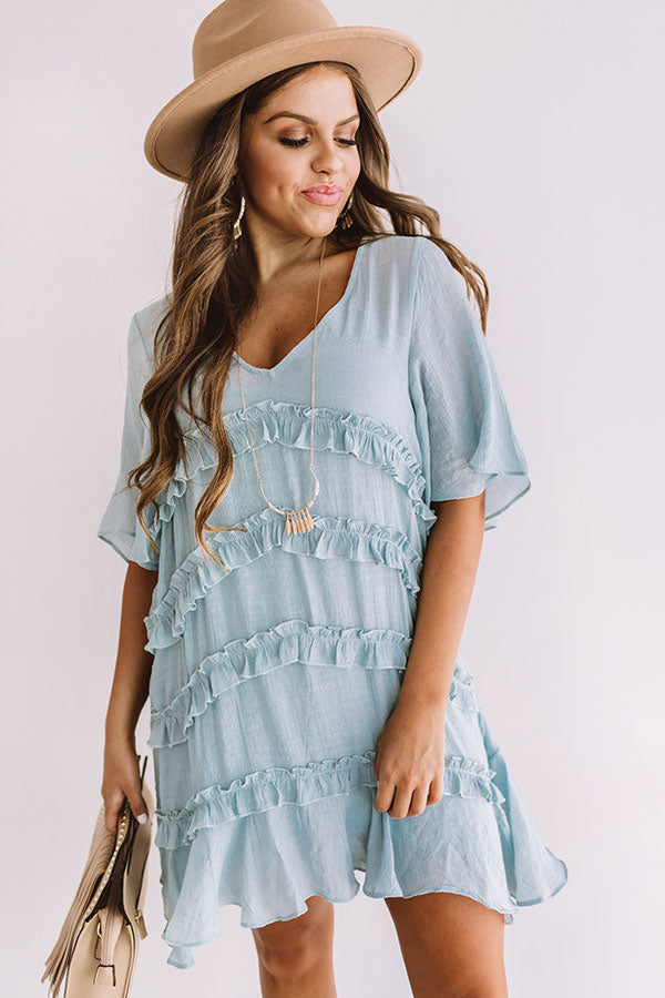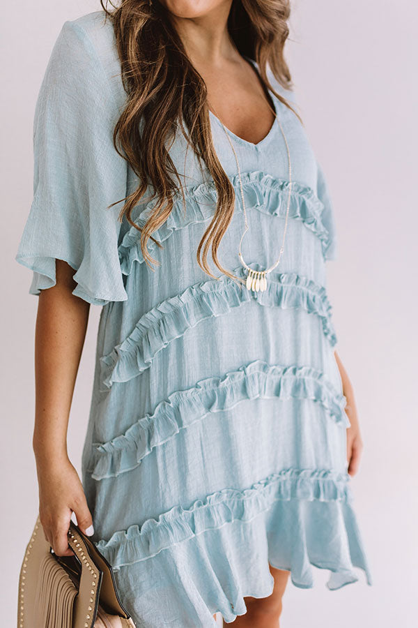 This airy blue shift dress is perfect for long walks and warm coffee shops with its ruffled tires, oversized peplum hem, loose short sleeves, and a v-neck with a flowy bodice! This elegant piece pairs gorgeously with a nude cutout wedge, faux suede hat, and crossbody or with printed accents like our "Elena Snake Print Heel" and "Twist And Shout Snake Print Headband" for a composed and chic date look! Measurements