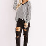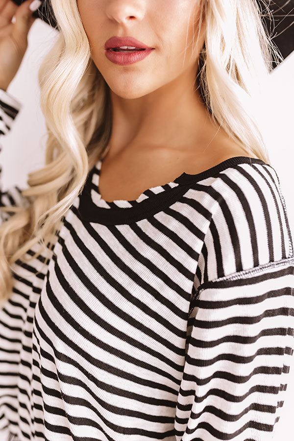 Take on any day in this cute closet essential! The "Denver daydream" shift top featuring lightweight material, black and white horizontal stripes, long loose sleeves, a high rounded black neckline, and an ultra relaxed bodice that falls into a tunic length hemline with side slits! We have styled this transitional piece with some distressed black skinnies, a black bootie and faux suede hat, but you can also wear it more causally with our "Trendsetter Mineral Wash Jogger In Airy Blue," our "Swiss Alps Getaway Backpack in Black," and "The Skye Sneaker in Black!" Measurements