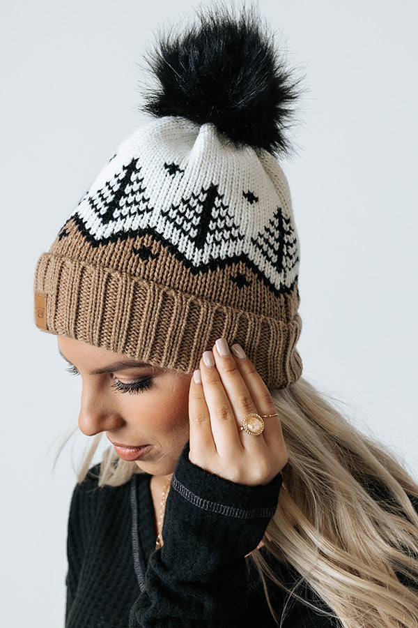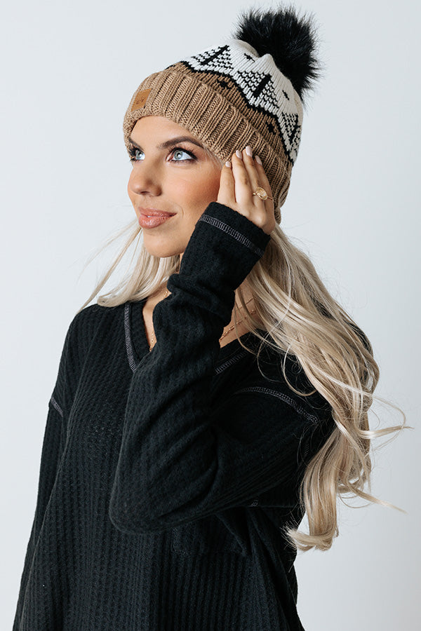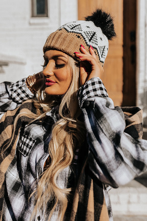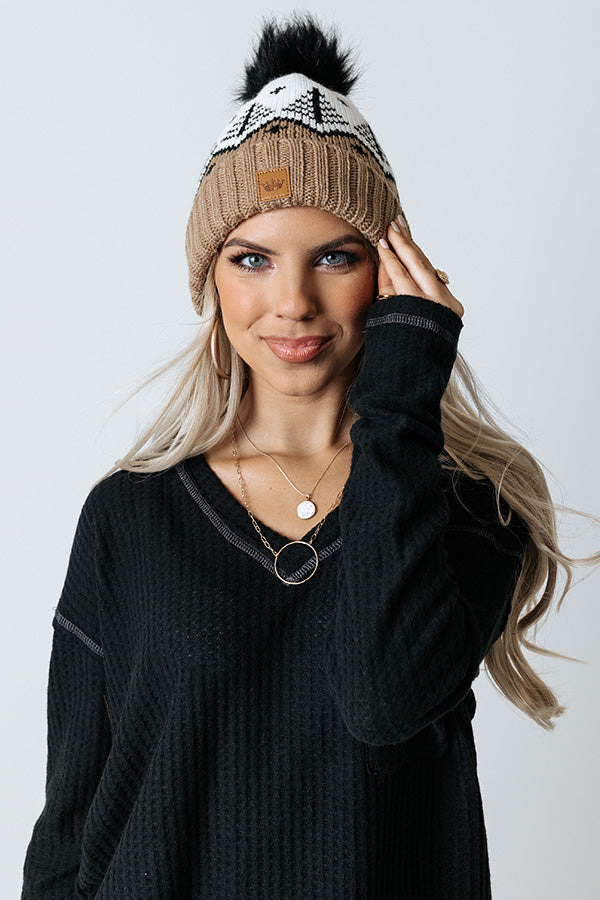 Stay stylish in our adorable white, black, and taupe hued 'Denver Debut Beanie' featuring ultra warm knit material lined with soft fleece, a rolled silhouette with ribbed texturing, and a black pom pom accent!