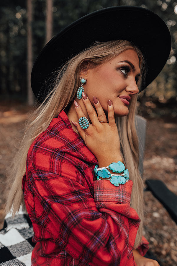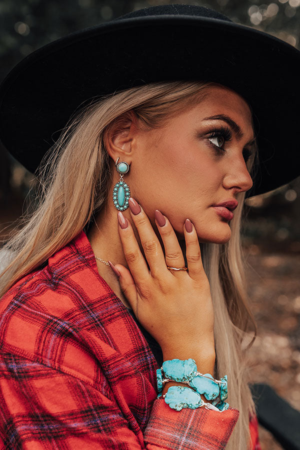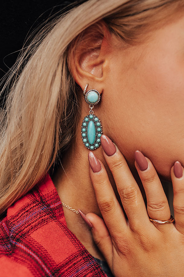 Add a darling pop of color to your OOTD with our pretty 'Denver Debut' statement earrings featuring a turquoise stud with a dangling oval turquoise pendant surrounded by smaller turquoise stones!