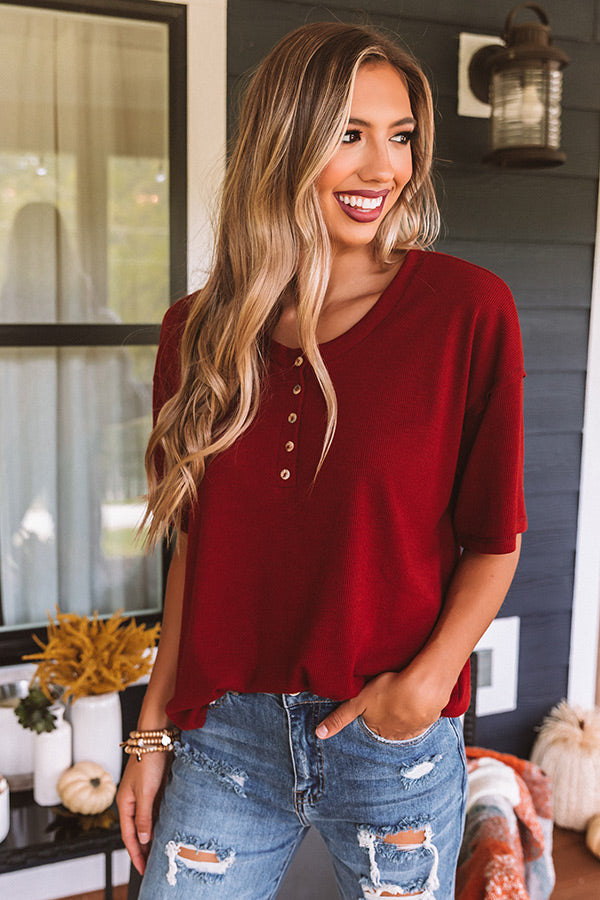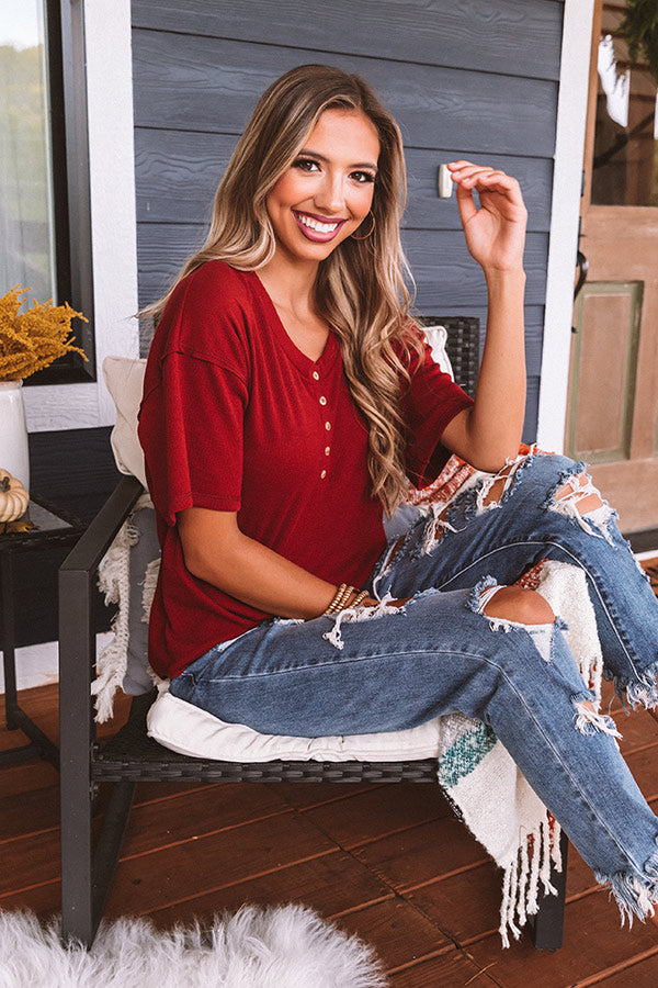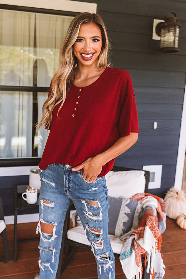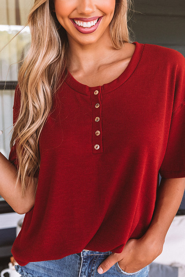 Keep it simple in our casual cute crimson colored "Denver Destination Shift Top" featuring soft lightweight material, a button up bodice with a high rounded neckline, short loose sleeves, and a relaxed silhouette that falls into a rounded hemline! Measurements