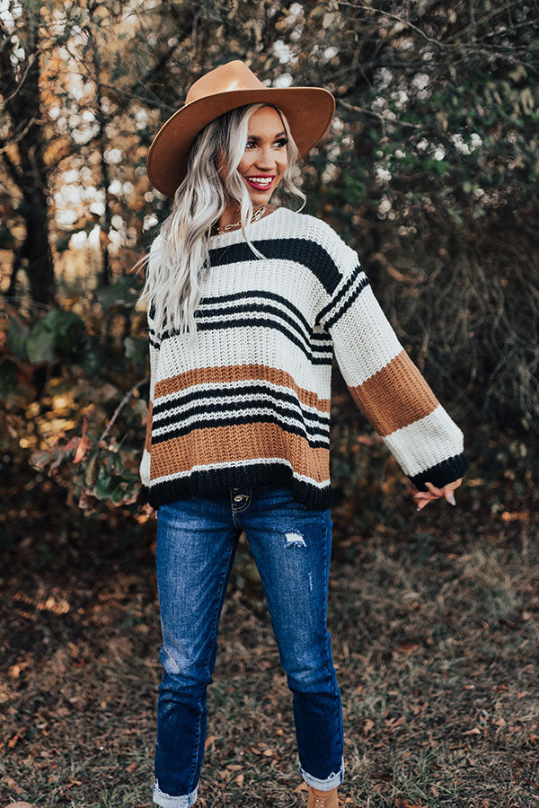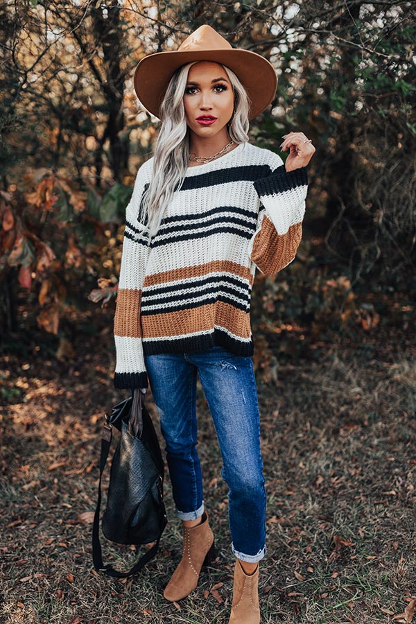Take your cold weather style to new heights with this charming sweater featuring soft lightweight but warm tight knit material with ribbed texturing, horizontal white, black, and camel colored accent stripes, a high rounded neckline, long loose sleeves, and a slouched silhouette that ends in a straight hemline! Measurements