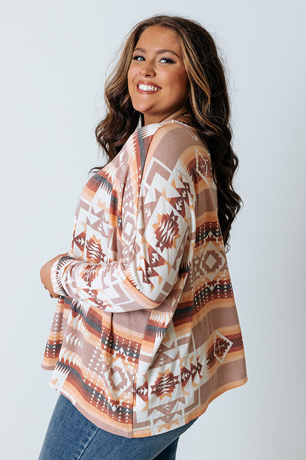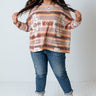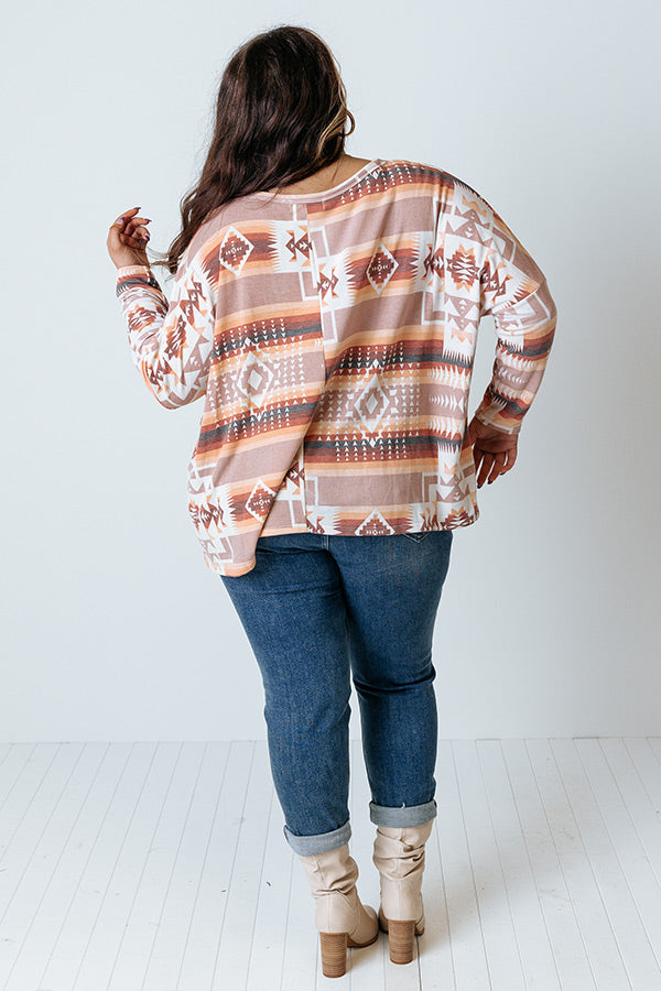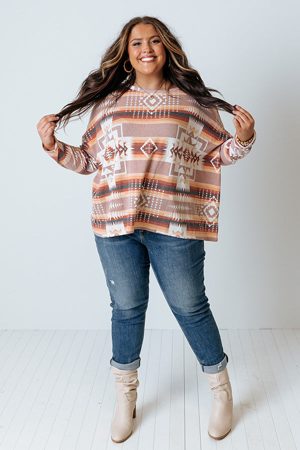 The perfect fall transitional piece just dropped! Our adorable plus size 'Denver Mountains Shift Top' features soft lightweight material patterned with orange and natural hued aztec prints, a wide rounded neckline, long loos sleeves, and a relaxed silhouette that falls into a straight hemline! Measurements