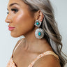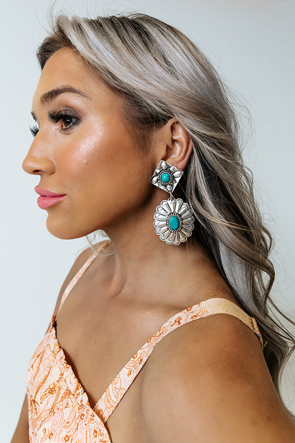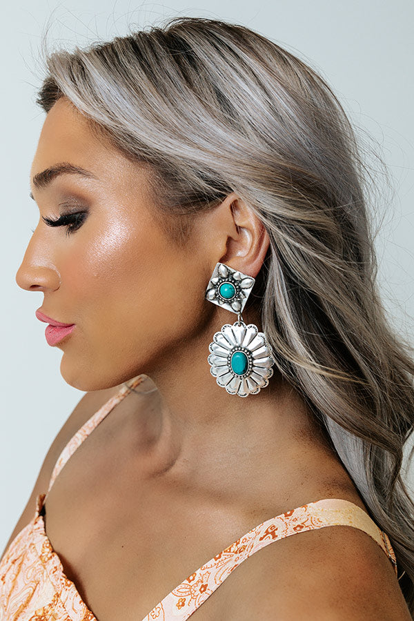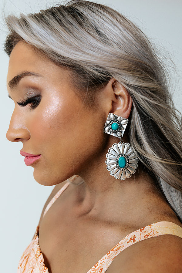 Your spring accessory style is sure to bloom with these stunning statement earrings featuring a large diamond shaped vintage silver stud with a small turquoise stone in the center and a dangling oversized vintage silver concho with an oval turquoise center!