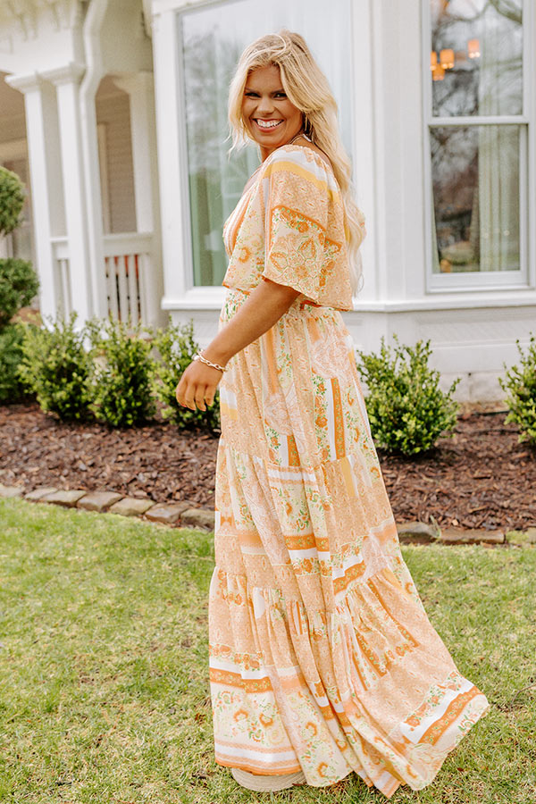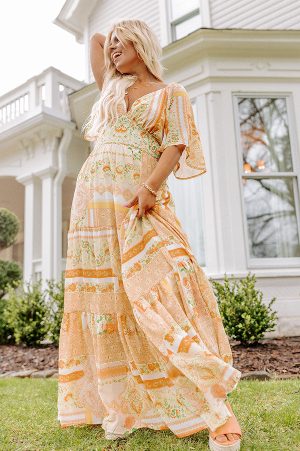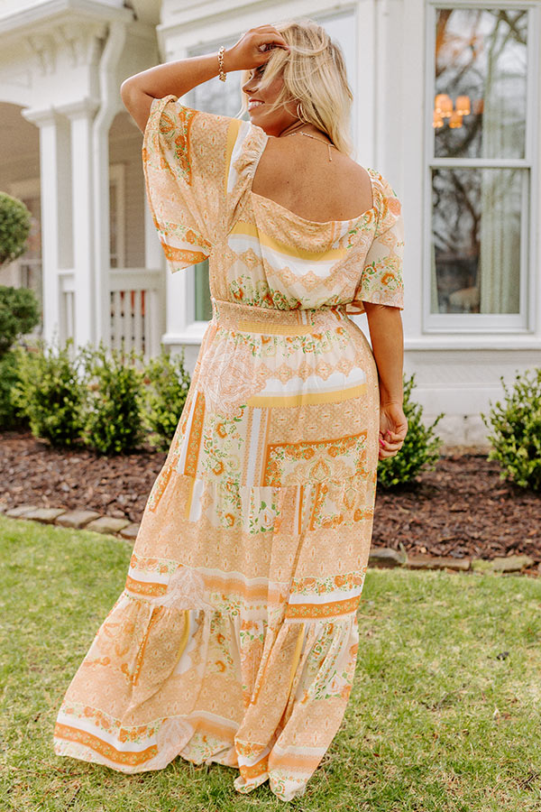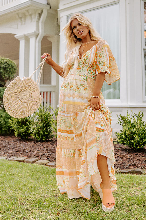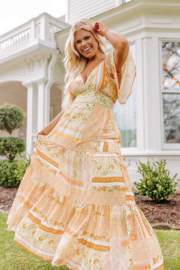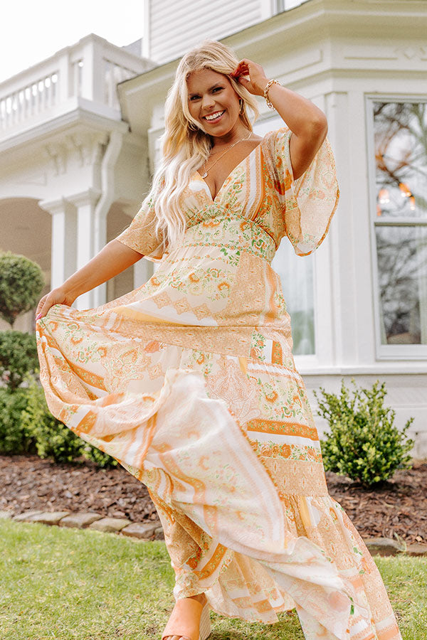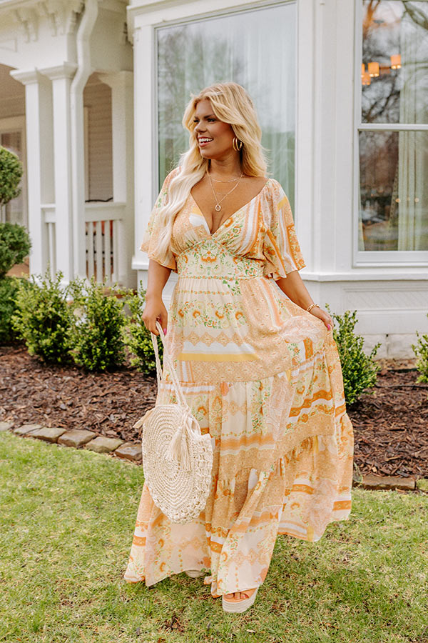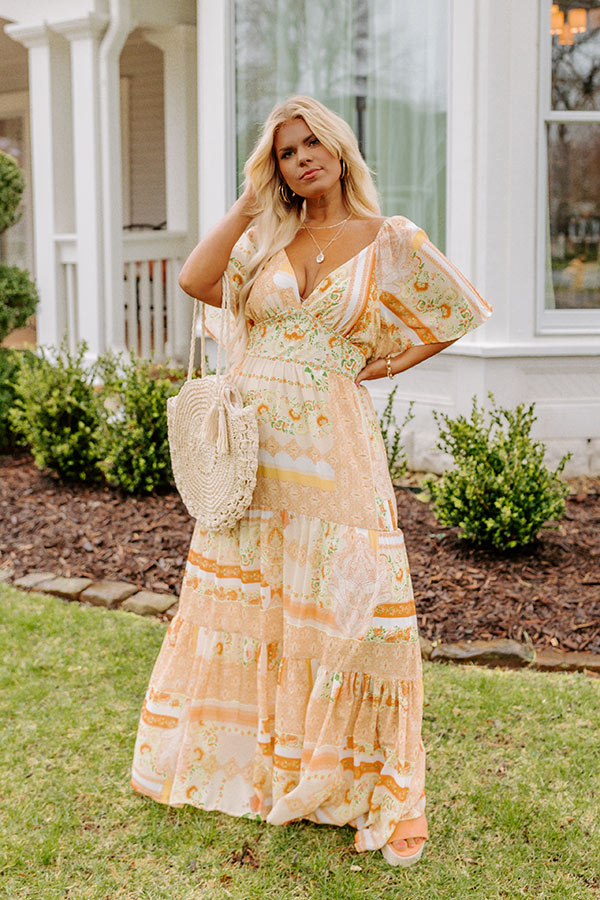 You will be dressed to impress when you arrive in our gorgeous plus size 'Desert Delight Maxi' featuring lightweight breezy material patterned with a intricate orange, light green, cream, and light peach hued floral print, a flirty bodice with a v-cut neckline, short loose sleeves, a fitted waistline, and a relaxed skirt silhouette that cascades into a straight ankle-length hemline!