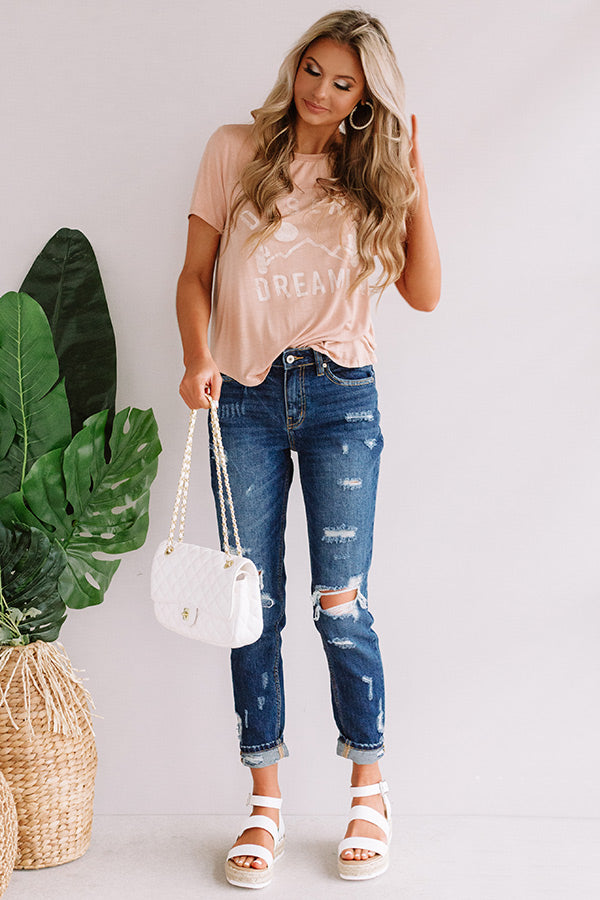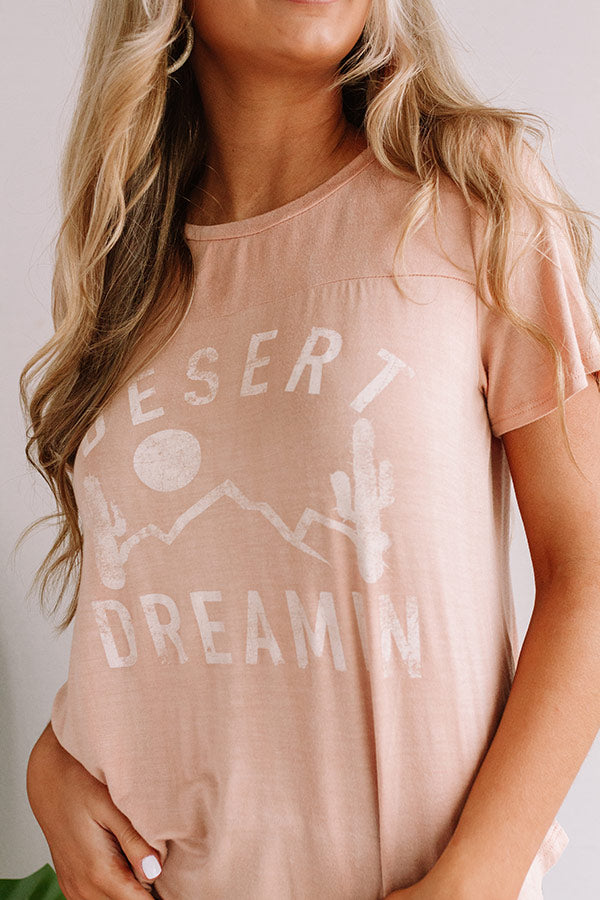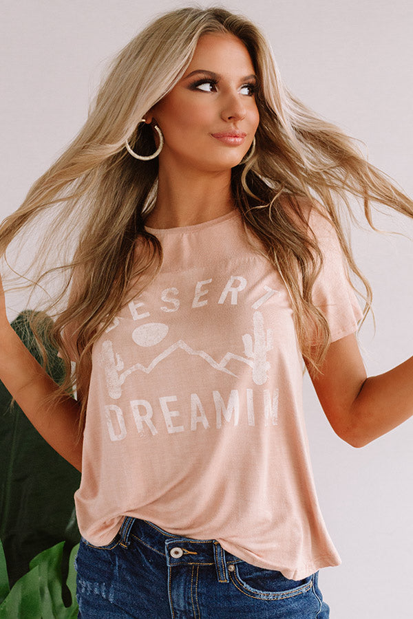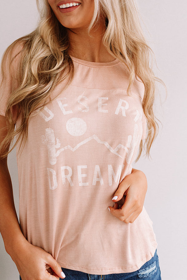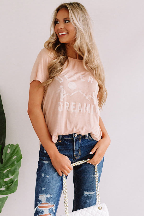 You will be a "desert dream" when you wear this blush boyfriend tee with its high rounded neckline, short sleeves, loose fit, rounded hemline, cute desert scene and lettering on the front! This casual piece can be styled with distressed jean shorts or ankle skinnies and a white espadrille and crossbody for a trendy summer look, or tucked into our "Modern Marvels Leopard Skirt in Ivory," sunnies, and "The Theo Heel in Blush" for more of a "relaxed Friday at the office" outfit! Measurements