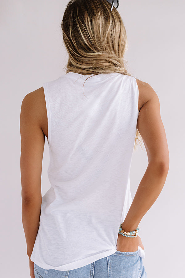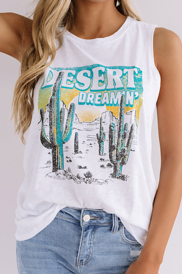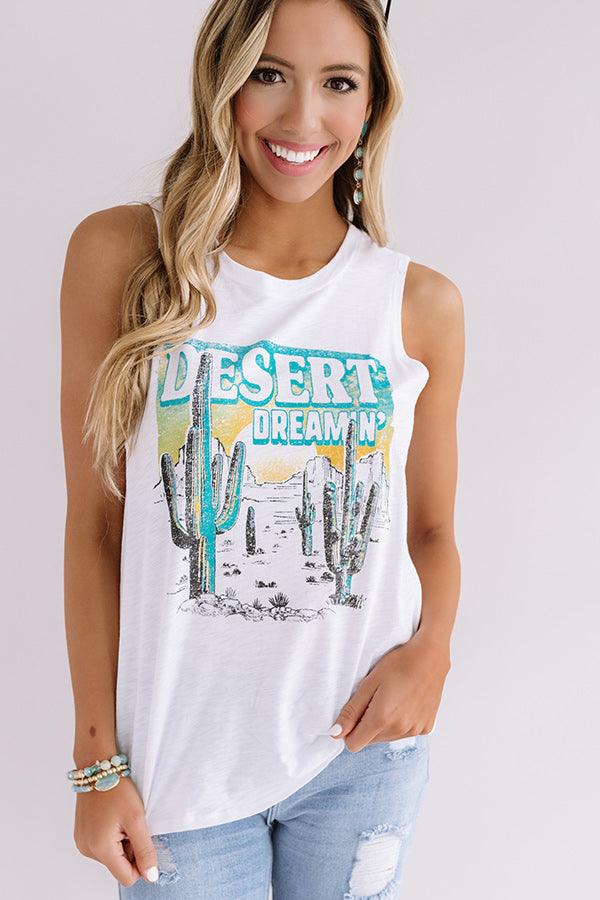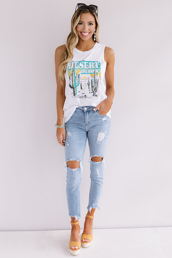 Keep it casual in our white chic grunge "Desert Dreamin'" boyfriend tank featuring soft lightweight material, a scooped neckline, wide 2-inch shoulder straps, an adorable blue and yellow cactus graphic on the front with cute block font, and a relaxed silhouette that falls into a straight hemline! We have styled this cutie up with some distressed jean shorts, but you can also dress it down with our "Let The Cozy Times Roll Joggers in Grey," our "Skye Sneaker in Black," and our "Swiss Alps Getaway Backpack in Black!" Measurements