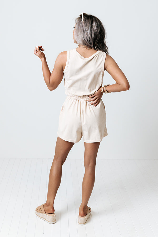 Stay cool this summer in our champagne colored 'Desert Heat Romper' featuring soft lightweight material, a button up bodice with a rounded neckline, wide sleeveless shoulders, a cinched waistline with a tie belt, accent side pockets, and a slouched silhouette that ends in straight upper-thigh length hemlines! Measurements