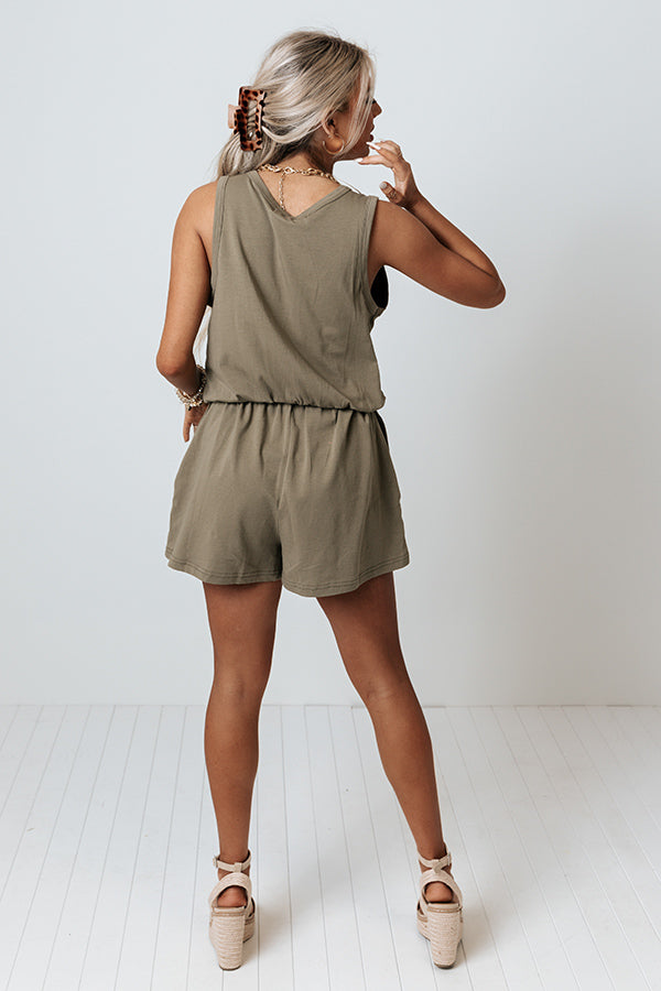 Stay cool this summer in our sage colored 'Desert Heat Romper' featuring soft lightweight material, a button up bodice with a rounded neckline, wide sleeveless shoulders, a cinched waistline with a tie belt, accent side pockets, and a slouched silhouette that ends in straight upper-thigh length hemlines! Measurements