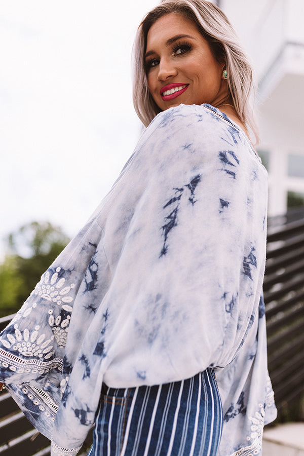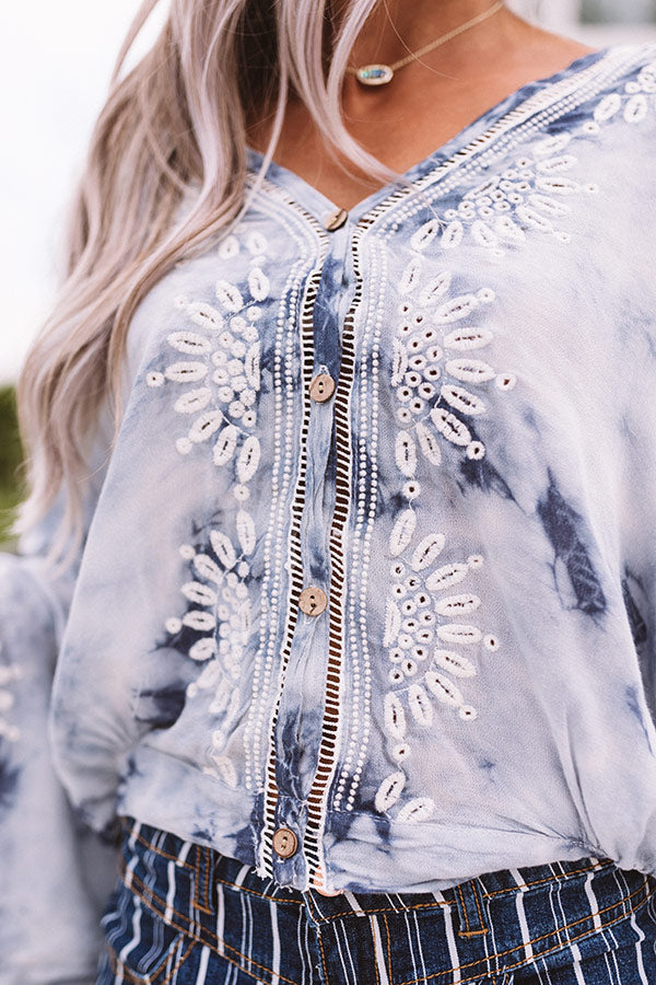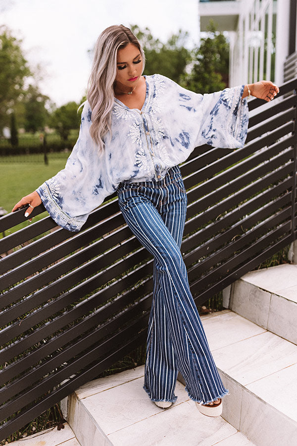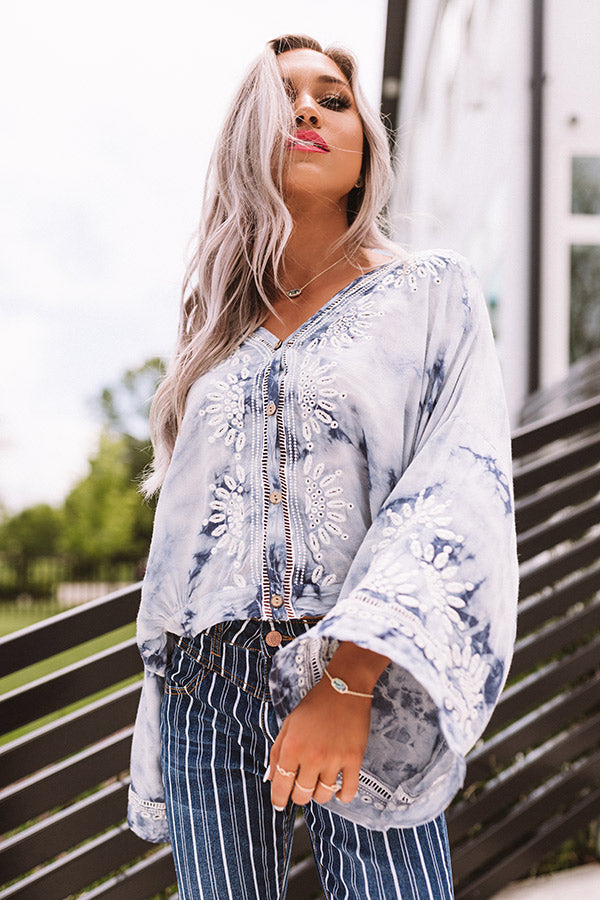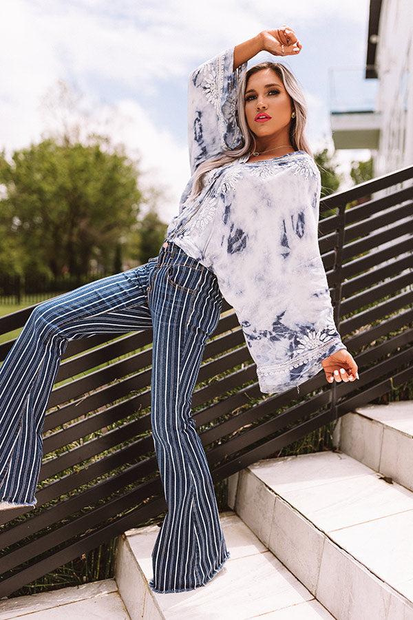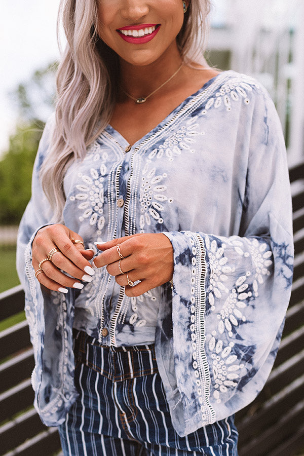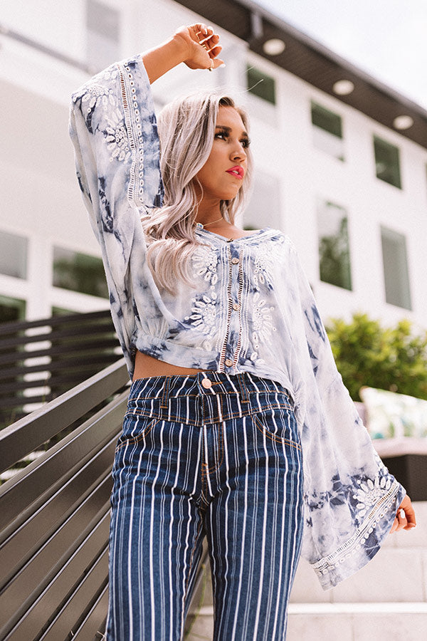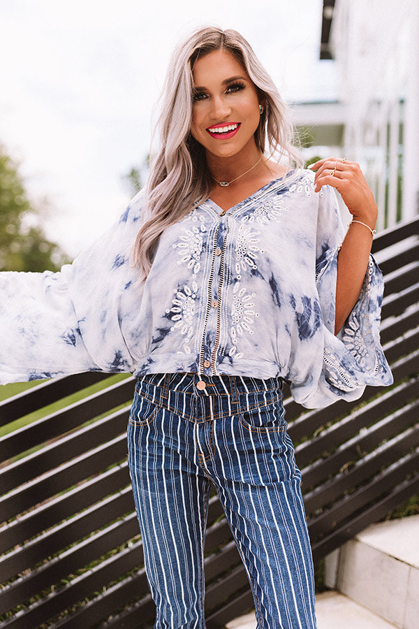 Add a unique splash of style to any OOTD with our trendy "Desert Mesa" top featuring lightweight breezy material patterned with navy tie dye and intricate eyelet flower detailing, a button down front with a v-cut neckline, accent lattice trim, long loose sleeves with flared cuffs, and a relaxed silhouette that falls into a straight hemline! We have paired this beauty with some pin stripe flares and wedges, but you can also wear it with some distressed jean shorts, the "Steve Madden Marcella Heel in White," our "Amalfi Bound Tote in Tan," and our "Tans And Tikis Sunnies in Tortoiseshell!" Measurements