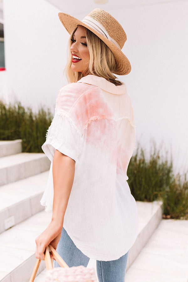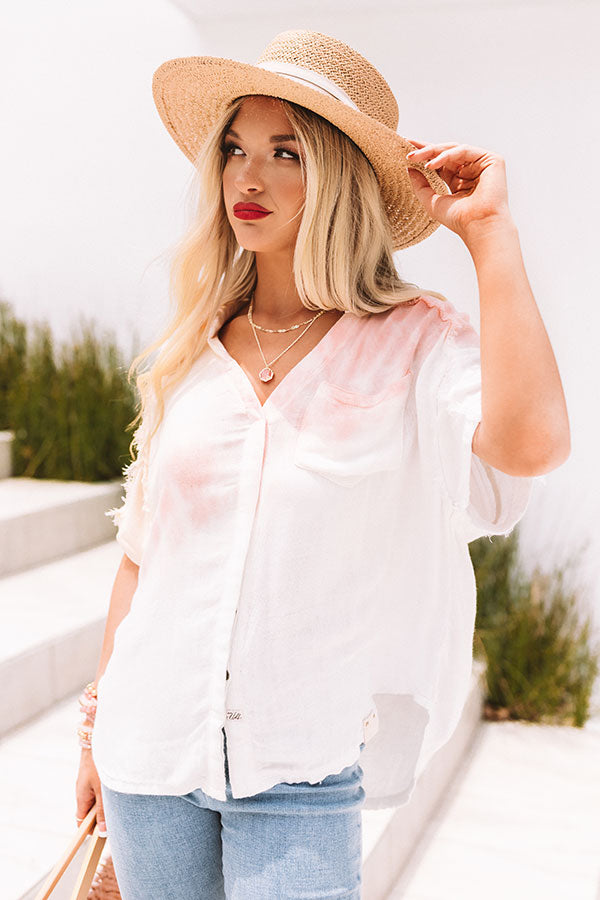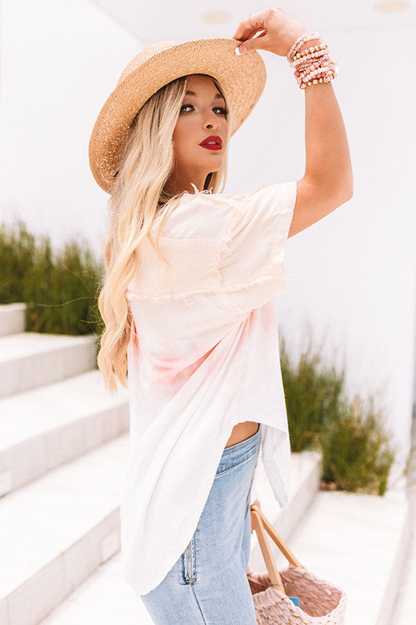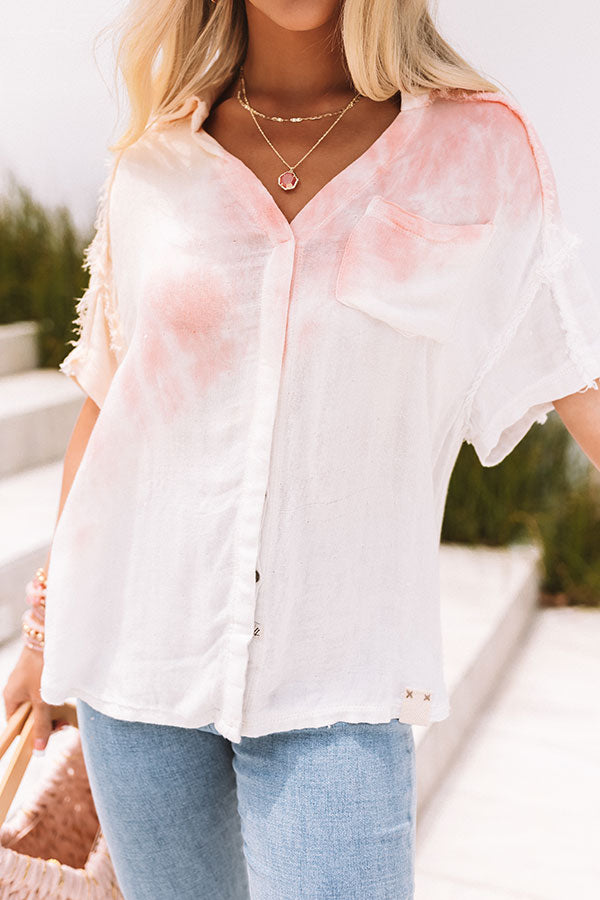 Keep cool this summer in our darling "Desert Retreat" top featuring soft lightweight material patterned with subtle watercolor tie dye, a collared v-cut neckline, short loose sleeves, a single accent chest pocket, exposed frayed seam detailing, and a relaxed silhouette that falls into a rounded tunic length hemline! We have styled this cutie with some light wash flares and a woven slip-on wedge and hat, but you can also wear it with some distressed white shorts, "The Mara Sandal in Pink," and our "Glam Expectations Faux Leather Tote in Pink!" Measurements