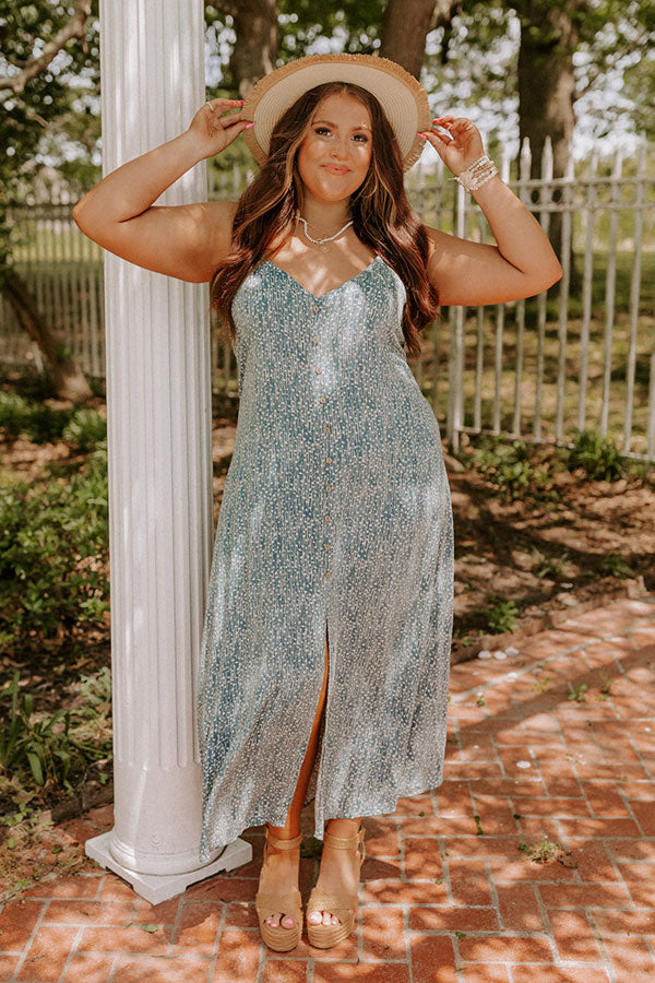 Get dressed effortlessly in our gorgeous teal plus size 'Desert Sensation Maxi' featuring lightweight material patterned with a small white print, a button down front with a v-cut neckline, adjustable spaghetti straps, and a relaxed silhouette that falls into a straight ankle-length hemline with an accent center front slit!