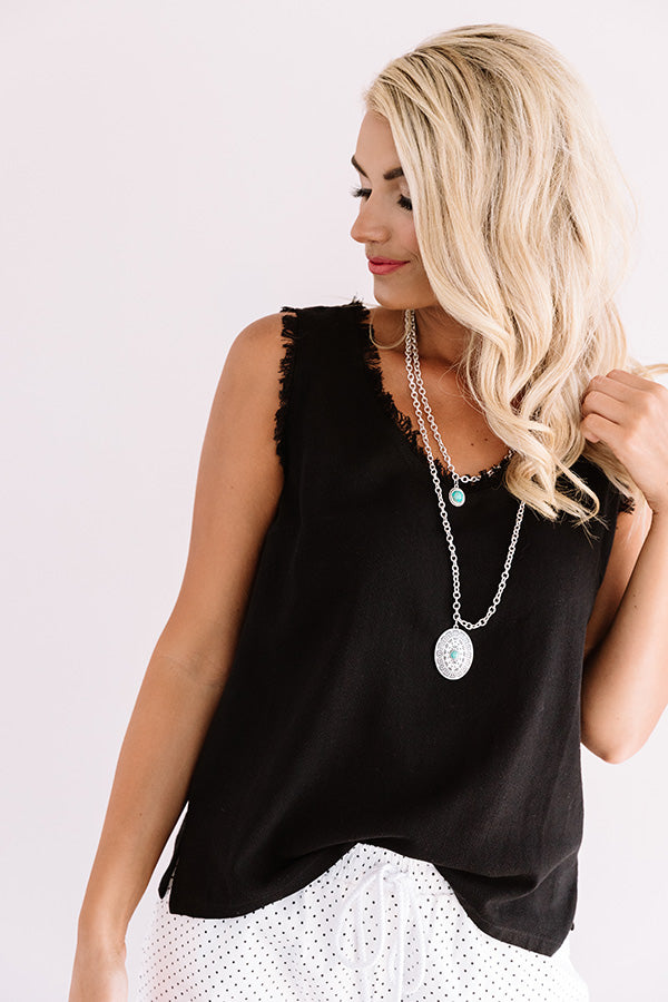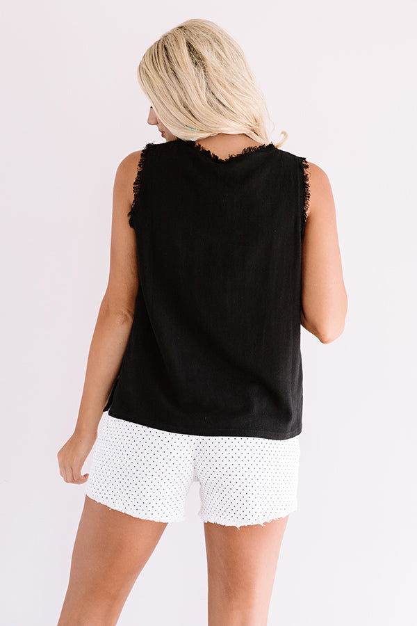 Keep your OOTD simple but sleek with our dainty black "Desert Views Shift Top" featuring lightweight material, a v-cut neckline, ruffled trim detailing, wide 2-inch sleeveless shoulder straps, and a relaxed silhouette that falls into a straight hemline with accent side slits! We have styled this upscale basic with some matching polka dot shorts and turquoise statement jewelry, but you can also wear it with some light wash flares, "The Rosella Wedge in Black," our "City Chic Faux Leather Tote in Black," and our "Fated Love Wool Hat!" Measurements
