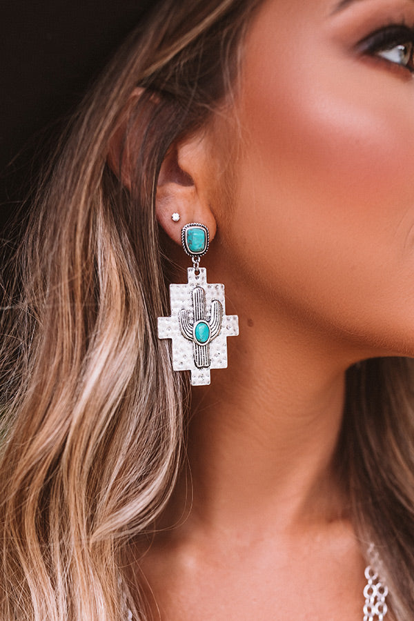 Add a touch of the wold west to your OOTD by accessorizing with our adorable "Desert Views" statement earrings featuring turquoise stone studs and dangling vintage silver cacti with turquoise stone accents in the center!