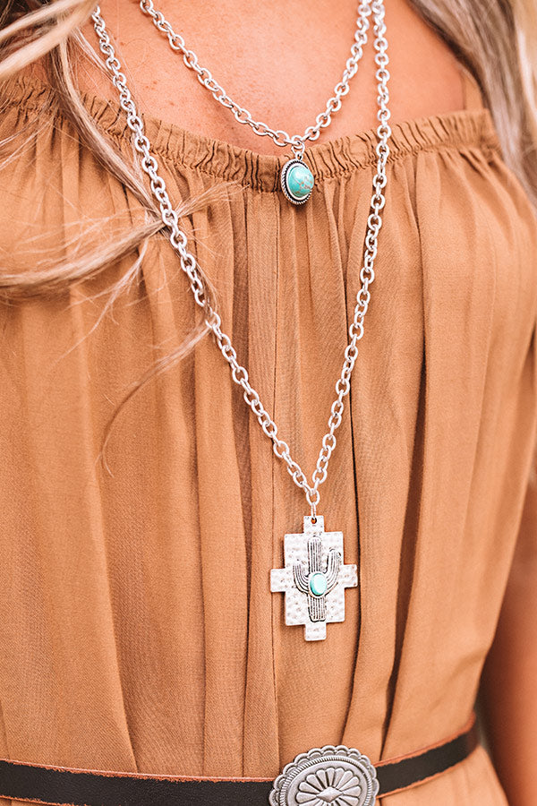 Add a touch of the wold west to your OOTD by accessorizing with our adorable "Desert Views" necklace featuring two long large link chains with a vintage silver cactus pendant and turquoise stone accents!