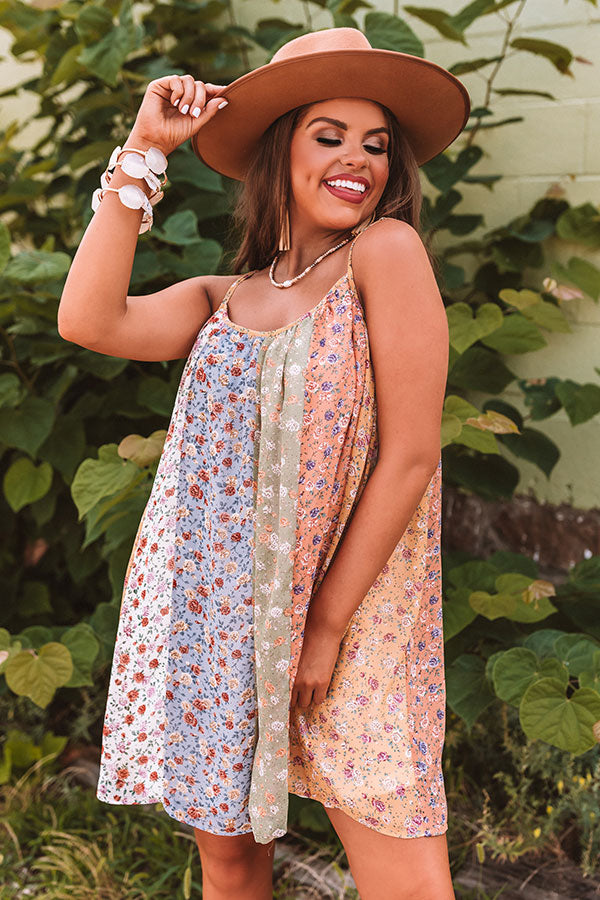 Add a boho touch to your wardrobe with our gorgeous "Destin Daze Shift Dress" featuring lightweight breezy material patterned with horizontal color block stripes and various small floral prints, a wide scooped neckline with adjustable spaghetti straps, and an ultra relaxed silhouette that falls into an uneven mid-thigh length hemline! We have layered this cutie under a jean jacket with some mustard wedges, a faux suede hat, and a woven tote and statement belt, but you can also wear it with "The Lula Block Heel in Lavender!" Measurements