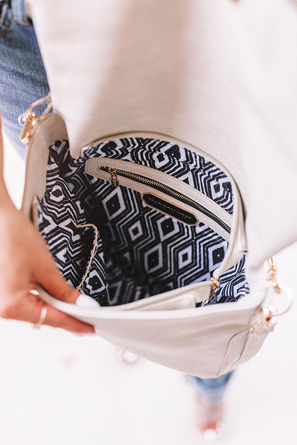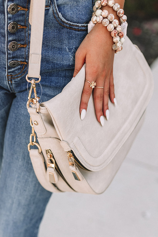 We have no doubt you will be obsessed with this versatile stone colored crossbody featuring lightweight faux leather material, a removable and adjustable shoulder strap, a shorter removable handle, a zip closure flap with a snap button, an outside back pocket, and a spacious fully lined rectangular pouch with an additional inside zip pocket!