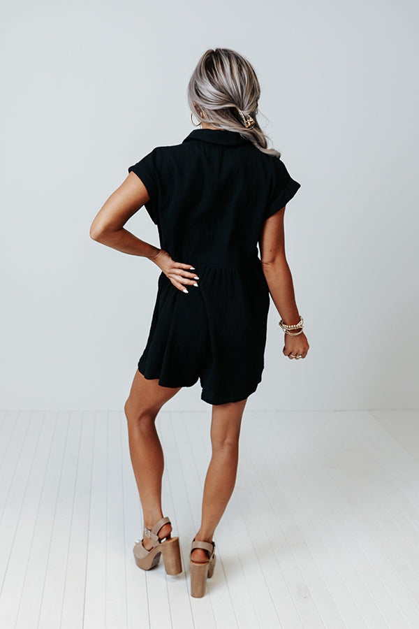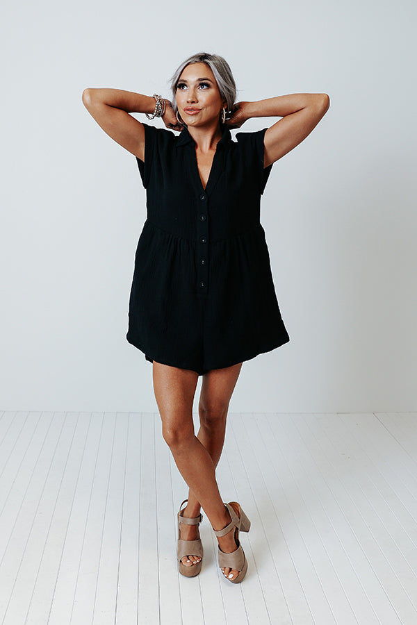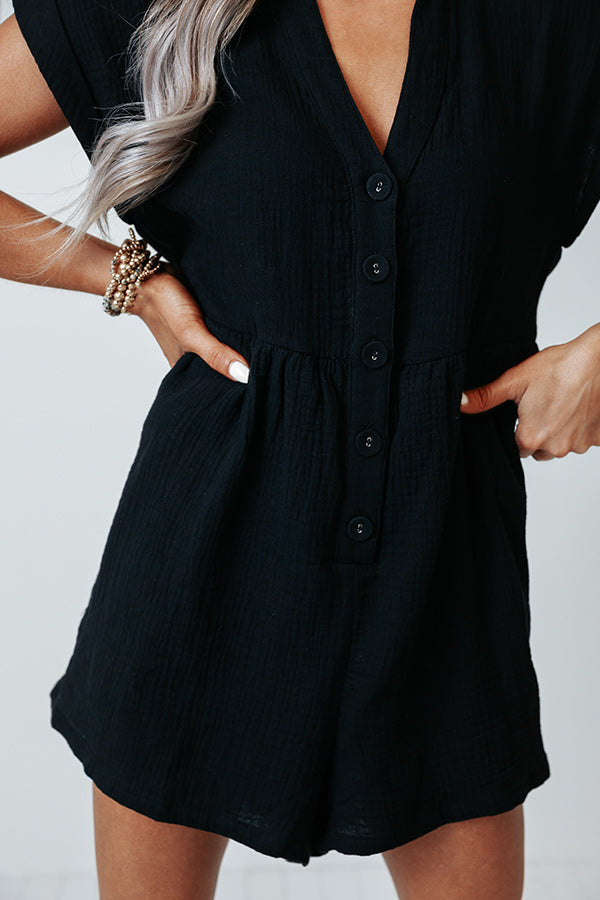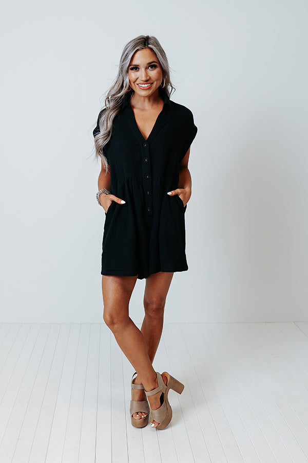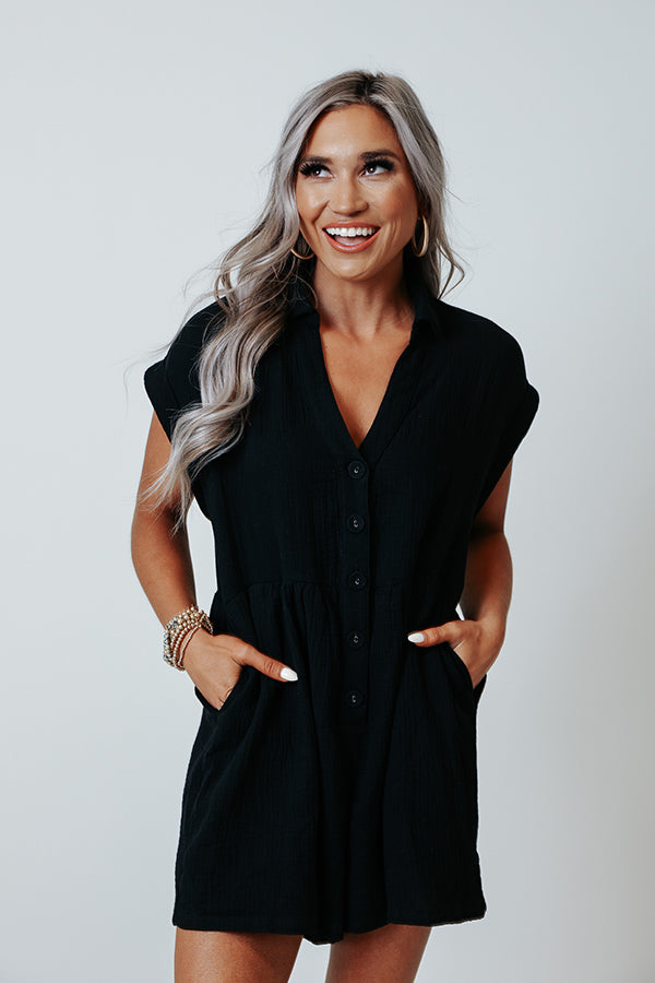 It's okay to be obsessed with this chic black romper...we are too! It features lightweight material, a button up front with a collared v-cut neckline, cap sleeve with rolled cuffs, hidden side pockets, and a relaxed but flattering shorts silhouette that ends in straight upper-thigh length hemlines! Measurements