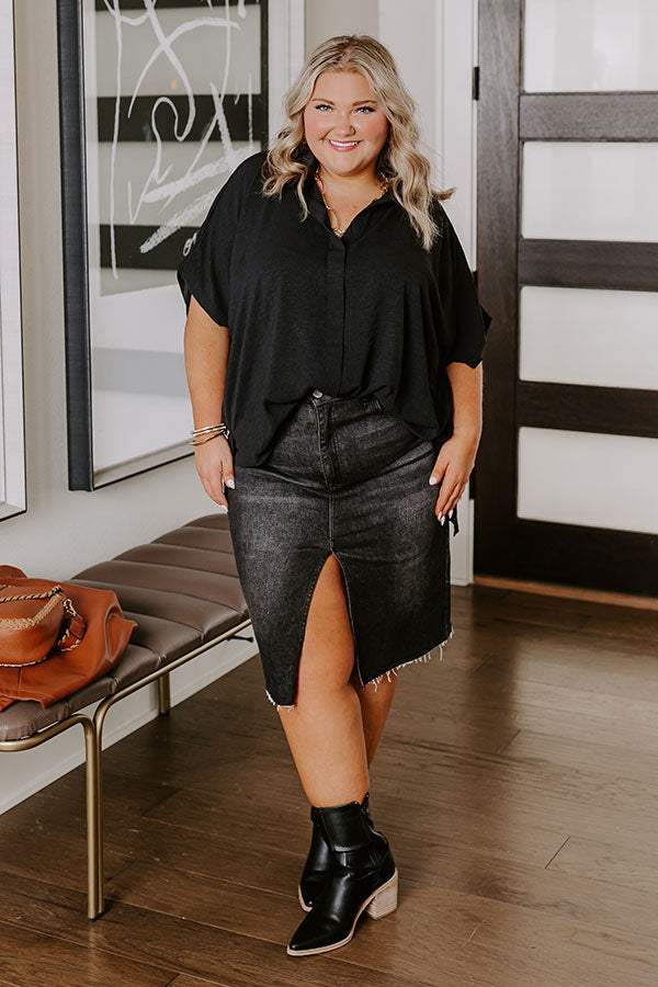 - An oversized silhouette that ends in a rounded hemline with side slit accents