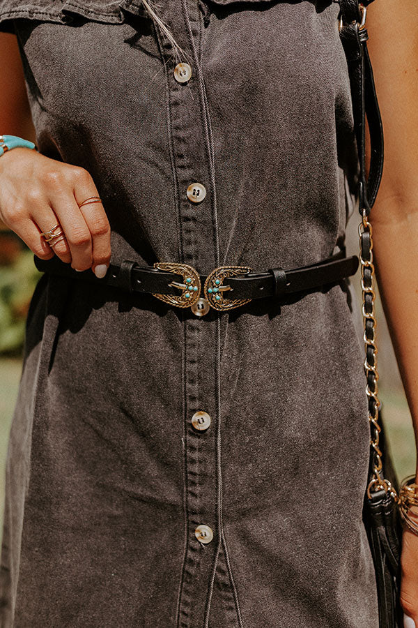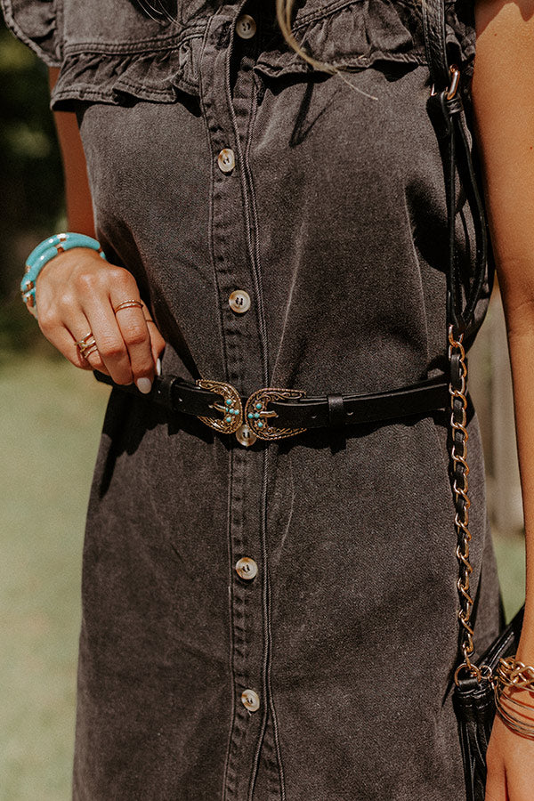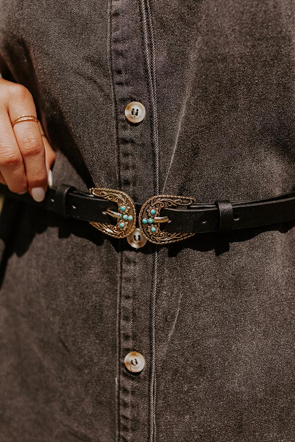 The perfect outfit completer, our pretty 'Dial It In' belt features a black faux leather strap and two vintage gold twin buckles with subtle turquoise detailing! This belt has a range of 28.5-33 inches.