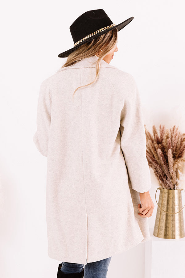 Travel for the holidays in style with our fashionable light birch hued 'Distance To Denver Coat' featuring lightweight but warm material, long loose sleeves, a collared neckline, low accent side pockets, a single button closure, and a flattering open front silhouette that falls into a straight mid-thigh length hemline! Measurements