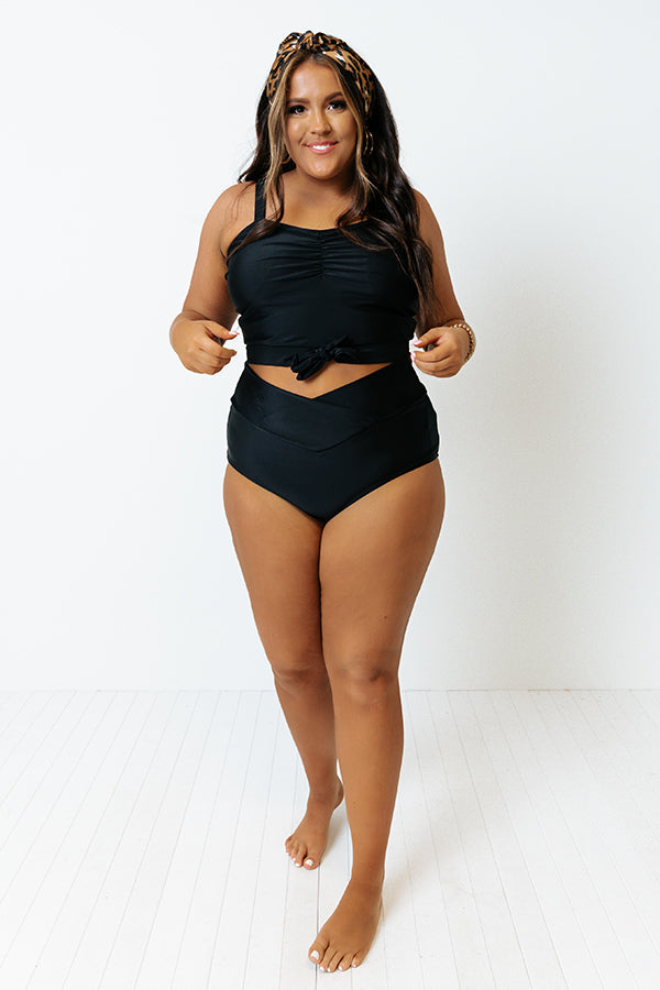 Dive right into summer effortlessly in this chic black plus size bikini bottom featuring lightweight four-way stretch material, a high waist subtle v-cut waistline, and a flattering figure hugging silhouette that ends in a cheeky fit!