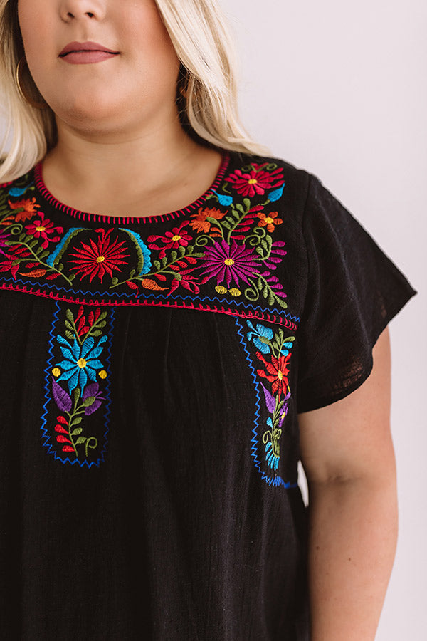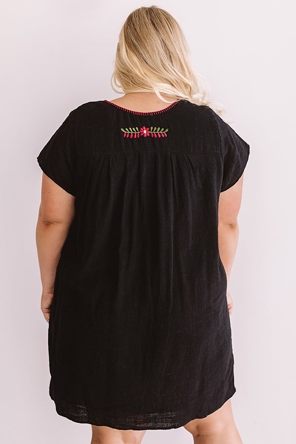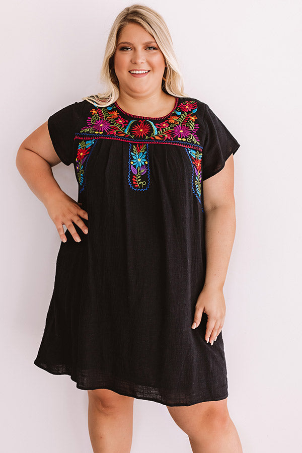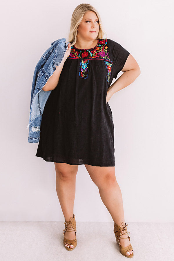 Plus Size - The "divine details" on this black dress are nothing short of stunning with its colorfully embroidered floral pattern, scooped neckline, short sleeves, lightweight material, and loose fit silhouette that falls into a straight mid-thigh length hemline! This intricately adorable piece can be styled under a trendy fall jacket with a neutral cutout wedge and tote, but if you wish to bring out the colors in the embroidery, you can accessorize "The Mia Faux Suede Lace Up Heel in Red" and our "Feeling Chic Tassel Earrings in Blue!" Measurements