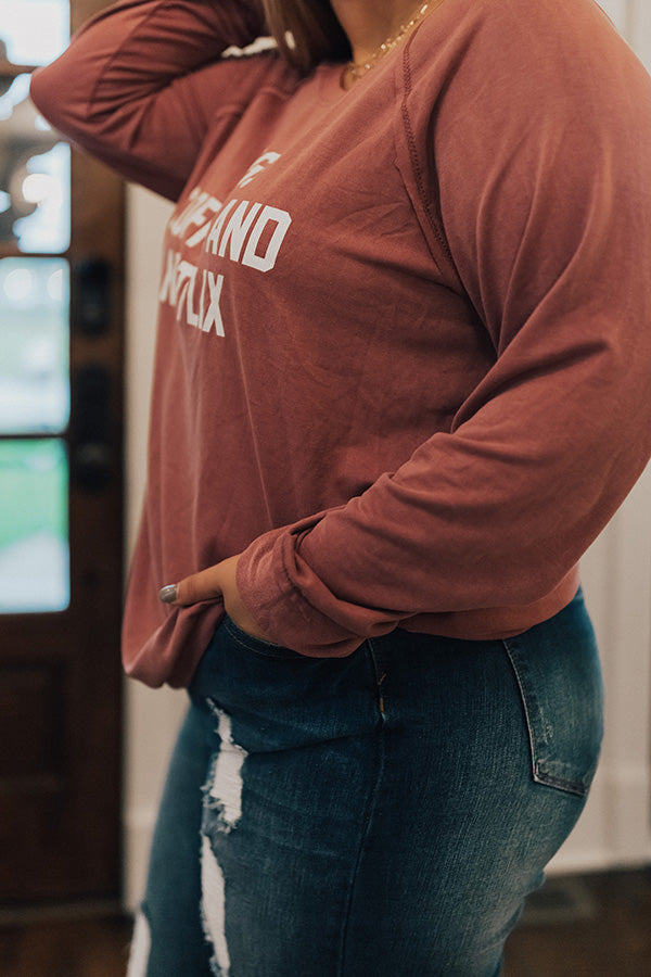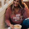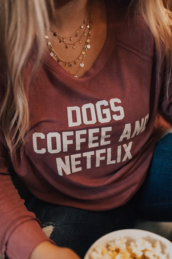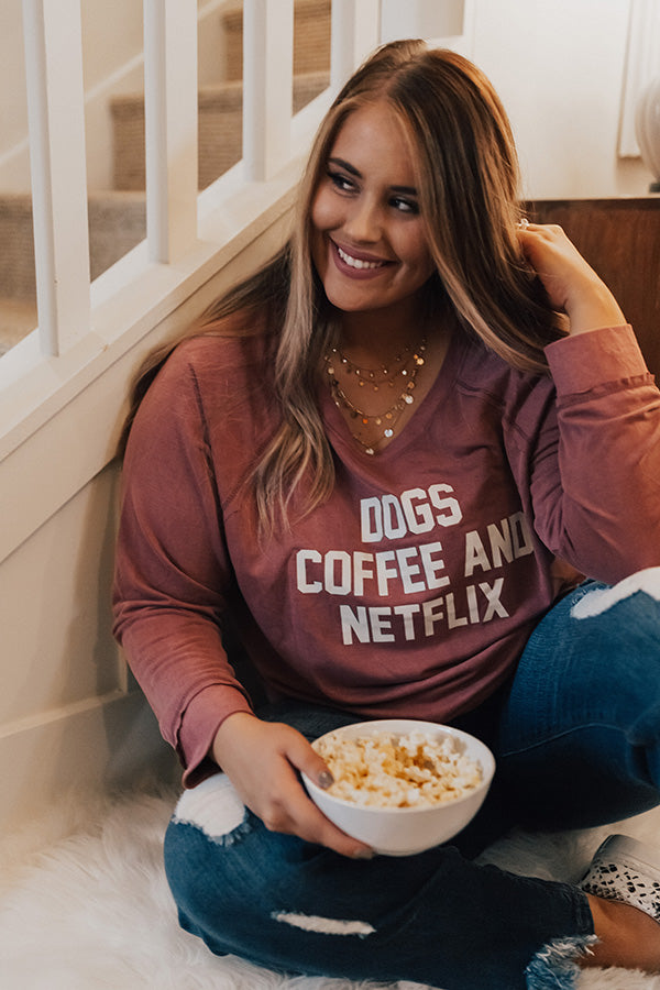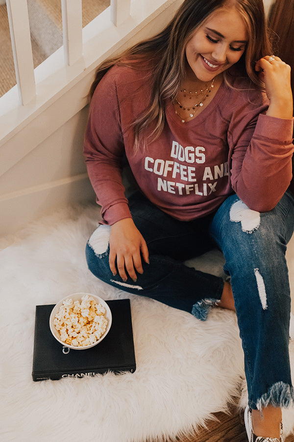 Plus Size - Dogs, coffee & netflix... 3 of our favorite things! Binge your favorite netflix series in style, in a lightweight graphic sweatshirt that is as comfy as it is cute. The "Dogs And Coffee Sweatshirt" has a round neckline, long sleeves & a lightweight poly/rayon bodice that reads: "Dogs, coffee & netflix."