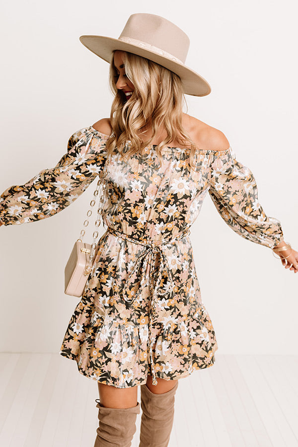 This stunning dress is the perfect dose of dreamy with its lightweight flowy material, intricate blush, mustard and cream hued floral print, an elastic off-shoulder silhouette with a straight neckline, long bubble drop sleeves with fitted cuffs, a cinched waistline with a tie belt, and a relaxed skirt silhouette that falls into an uneven mid-thigh length hemline!