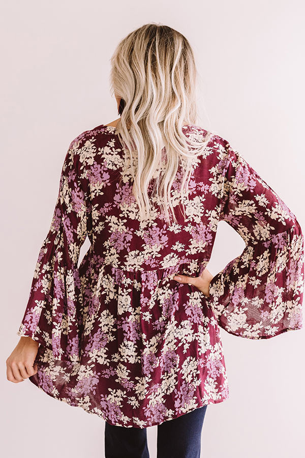Your fall style will blossom when you wear the "Down In The Valley" top featuring lightweight material, a subtle windsor wine hue with a bold floral pattern, a v-cut neckline with lace and criss crossed strap detailing, long oversized quarter length sleeves with flares cuffs, and an ultra relaxed babydoll silhouette that falls into a straight hemline! Measurements