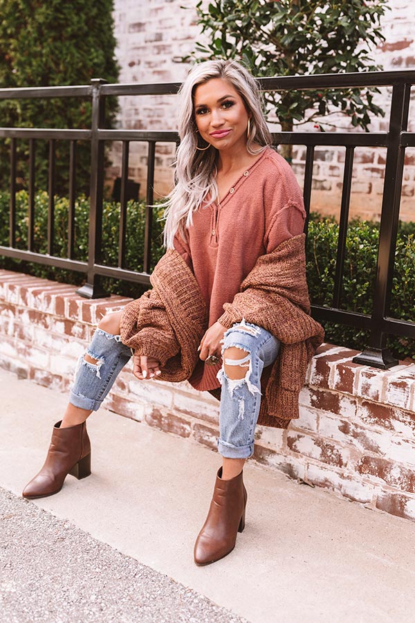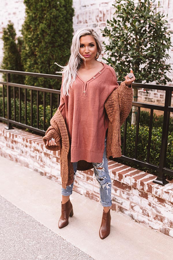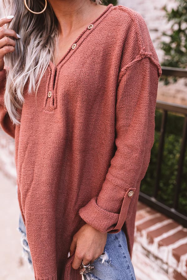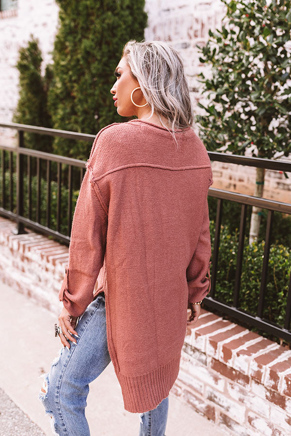 Take a stroll in style with our rustic rose colored 'Down Memory Lane' sweater featuring soft lightweight tight knit material, a button up bodice with a v-cut neckline, long loose sleeves with roll-tab cuffs, exposed seam detailing, and an ultra slouched silhouette that falls into a straight tunic-length hemline with high accent side slits! Measurements
