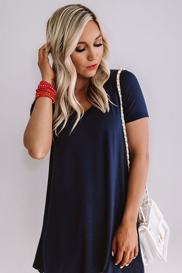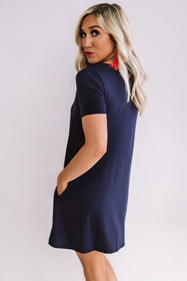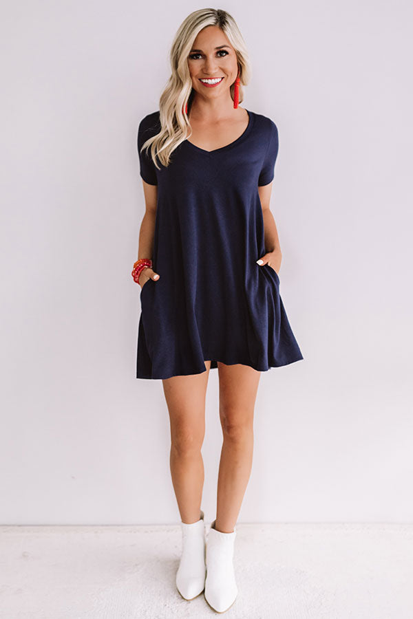 Down, set, chic! This basic navy t-shirt dress is perfect for wearing on game day with its rounded v-neckline that can be worn off one shoulder, short sleeves, and breezy silhouette! Measurements